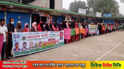 ঝালকাঠিতে ন্যাশনাল সার্ভিস প্রকল্প স্থায়ীকরণের দাবিতে মানববন্ধন।
