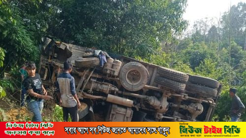 রাজস্থলীতে সীমান্ত সড়কের পাথর বোঝাই ট্রাক উল্টে খাদে।