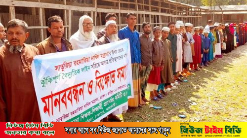 রাজাপুরে ঝুকিপূর্ণ বিদ্যুতের খুঁটি স্থানান্তরের দাবীতে মানববন্ধন।