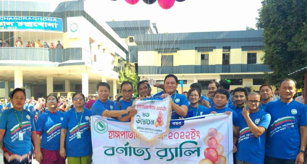 ছবির ক্যাপশনঃ চন্দ্রঘোনা খ্রীস্টিয়ান হাসপাতালের ১১৫ বছর পুর্তি উপলক্ষে শনিবার সকালে হাসপাতাল চত্বর হতে র্যাালী বের করা হয়।