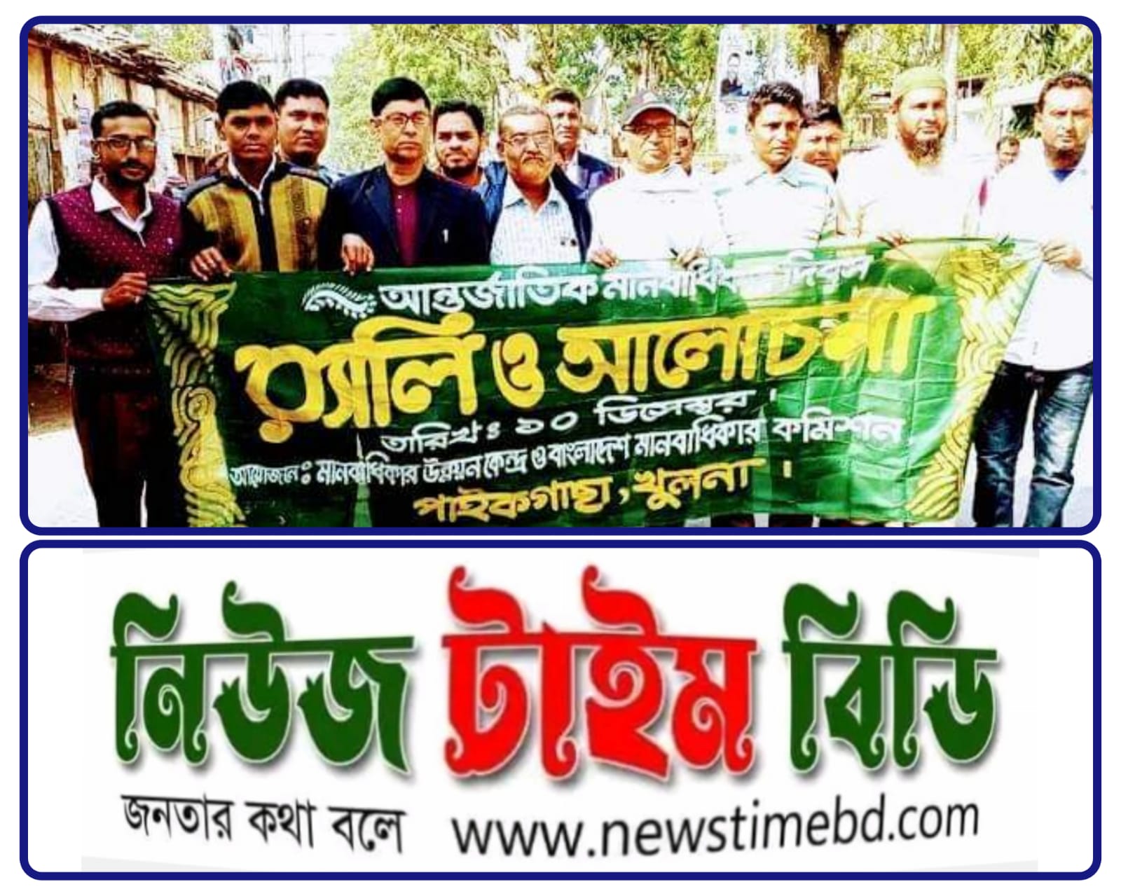 খুলনার পাইকগাছায় মানবাধিকার উন্নয়ন কেন্দ্র ও বাংলাদেশ মানবাধিকার কমিশনের উদ্যোগে আন্তর্জাতিক মানবাধিকার দিবস উপলক্ষে র্যালি ও আলোচনা সভা অনুষ্ঠিত হয়েছে। ১০ই ডিসেম্বর (শনিবার)সকালে পাইকগাছা প্রেসক্লাবে মানবাধিকার উন্নয়ন কেন্দ্রের নির্বাহী পরিচালক ও ঘপাইকগাছা প্রেসক্লাবের সভাপতি এডঃ এফ এম এ রাজ্জাকের সভাপতিত্বে আলোচনা সভায় প্রধান অতিথি হিসেবে উপস্থিত ছিলেন পাইকগাছা আইনজীবী সমিতির সভাপতি ও পৌরসভা মানবাধিকার কমিশনের সভাপতি এডঃ অজিত কুমার মন্ডল, বিশেষ অতিথি হিসেবে উপস্থিত ছিলেন,উপজেলা মানবাধিকার কমিশনের সভাপতি এডঃ প্রধীশ কুমার হালদার, মানবাধিকার উন্নয়ন কেন্দ্রের সাধারণ সম্পাদক সাংবাদিক আলাউদ্দীন রাজা।বক্তব্য রাখেন সাংবাদিক বদিউজ্জামান, সাংবাদিক পূর্ণ চন্দ্র মন্ডল,মানছুর রহমান জাহিদ, খোরশেদ আলম,শাহজামান বাদশা, উজ্জ্বল কুমার দাস,জাকির হোসেন মিন্টু,স্বপন কুমার সরকার,দেবপ্রসাদ মন্ডল, আব্রাহাম সরকার,জিয়াউদ্দিন নায়েব,এম জালাল উদ্দিন প্রমুখ।এ সময় বিভিন্ন শ্রেনী পেশার গণ্যমান্য ব্যক্তিবর্গ উপস্থিত ছিলেন।
