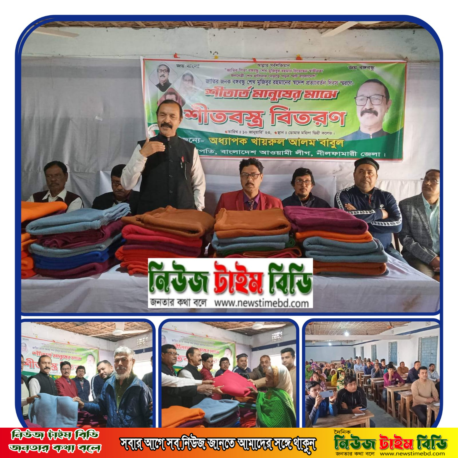 মঙ্গলবার ১০ জানুয়ারি বেলা ১১ টায় ডোমার মহিলা ডিগ্রি কলেজ হলরুমে ডোমার মহিলা ডিগ্রি কলেজের অধ্যক্ষ শাহিনুল ইসলাম বাবু’র সভাপতিত্বে শীতবস্ত্র বিতরণ অনুষ্ঠানে প্রধান অতিথি হিসেবে উপস্থিত থেকে শীতার্ত মানুষের মাঝে শীতবস্ত্র বিতরণ করেন নীলফামারী জেলা আ”লীগের সহ-সভাপতি ও বিশিষ্ট শিক্ষাবিদ এবং উপজেলা আ”লীগের সাবেক সফল সভাপতি অধ্যাপক খায়রুল আলম বাবুল।