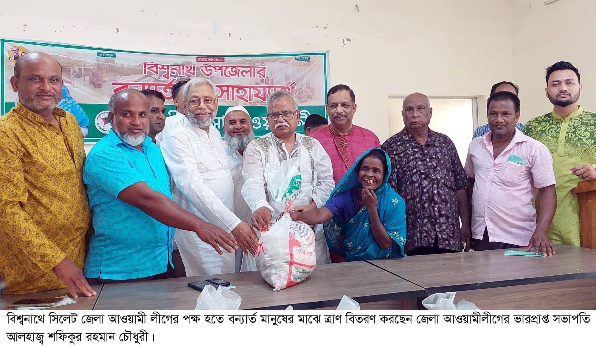 টানা বর্ষণ ও পাহাড়ী ঢলের পানিতে সৃষ্ট আকস্মিক বন্যায় ক্ষতিগ্রস্থ সিলেটের বিশ্বনাথ উপজেলায় বন্যার্ত ১২৫টি পরিবারের সদস্যদের মধ্যে জেলা আওয়ামী লীগের পক্ষ থেকে ত্রাণ বিতরণ করা হয়েছে। শুক্রবার (২৭ মে) বিকেলে উপজেলা পরিষদ অডিটোরিয়ামে প্রধান অতিথি হিসেবে ত্রাণ বিতরণ করেন জেলা আওয়ামী লীগের ভারপ্রাপ্ত সভাপতি ও স্থানীয় সাবেক সংসদ সদস্য আলহাজ্ব শফিকুর রহমান চৌধুরী। ত্রাণ বিতরণ অনুষ্ঠানে প্রধান অতিথির বক্তব্যে শফিকুর রহমান চৌধুরী বলেন, বঙ্গবন্ধু কন্যা প্রধানমন্ত্রী শেখ হাসিনা’র নেতৃত্বাধীন সরকার যতদিন ক্ষমতায় থাকবে, ততদিন দেশের মানুষের খাদ্যের কষ্ঠ হবে না। কোন মানুষই না খেয়ে মারা যাবেন না। আওয়ামী লীগের নেতৃত্বাধীন সরকারের আমলে দেশে যতেষ্ট পরিমাণ ত্রাণ মজুদ রয়েছে। কারণ বাংলাদেশ এখন জাতির জনকের কন্যার নেতৃত্বে উন্নয়নের দিকে এগিয়ে যাচ্ছে। দেশবাসীকে শুধু নির্বাচন এলে নৌকায় ভোট দিয়ে আওয়ামী লীগের প্রার্থীদের বিজয়ী করে জননেত্রী শেখ হাসিনা’কে বার বার প্রধানমন্ত্রী নির্বাচিত করতে হবে। বিশ্বনাথ উপজেলা আওয়ামী লীগের সভাপতি আলহাজ্ব পংকি খাঁনের সভাপতিত্বে ও ভারপ্রাপ্ত সাধারণ সম্পাদক ফারুক আহমদের পরিচালনায় ত্রাণ বিতরণ অনুষ্ঠানে বিশেষ অতিথির বক্তব্য রাখেন জেলা আওয়ামী লীগের সহ সভাপতি অ্যাডভোকেট শাহ মোশাহিদ আলী। বক্তব্য রাখেন উপজেলা আওয়ামী লীগের ত্রাণ ও সমাজকল্যাণ সম্পাদক আব্দুল মতিন, কার্যনির্বাহী সদস্য আনোয়ার মিয়া। অনুষ্ঠানে এসময় উপস্থিত ছিলেন উপজেলা আওয়ামী লীগের তথ্য ও গবেষণা সম্পাদক আনোয়ার হোসেন, বন ও পরিবেশ সম্পাদক রুনু কান্ত দে, উপ-দপ্তর সম্পাদক নুরুল হক, কার্যনির্বাহী সদস্য নিজাম উদ্দিন, পৌর আওয়ামী লীগের আহবায়ক আব্দুল জলিল জালাল, যুগ্ম আহবায়ক মহব্বত আলী জাহান, লামাকাজী ইউনিয়ন আওয়ামী লীগের ভারপ্রাপ্ত সভাপতি পুলক ভট্টাচার্য্য, সাংগঠনিক সম্পাদক আব্দুর রব, দৌলতপুর ইউনিয়ন আওয়ামী লীগের সভাপতি হাজী আরিফ উল্লাহ সিতাব, সাধারণ সম্পাদক আব্দুল আজিজ, দেওকলস ইউনিয়ন আওয়ামী লীগের সভাপতি আব্দুল মুমিন, সাধারণ সম্পাদক দিলওয়ার হোসেন রুপন, অলংকারী ইউনিয়ন আওয়ামী লীগের ভারপ্রাপ্ত সভাপতি হাজী হিরা মিয়া, সাধারণ সম্পাদক তফজ্জুল আলী, দশঘর ইউনিয়ন আওয়ামী লীগের আবুল হোসেন, সহ সভাপতি তজম্মুল আলী, খাজাঞ্চী ইউনিয়ন আওয়ামী লীগের সাধারণ সম্পাদক শংকর চন্দ্র ধর, বিশ্বনাথ ইউনিয়ন আওয়ামী লীগের আহবায়ক শাহ নেওয়াজ চৌধুরী সেলিম, যুগ্ম আহবায়ক আব্দুর রউফ, আওয়ামী লীগ নেতা শানুর আহমদ জয়দু, রকন মিয়া, সাইদুল ইসলাম, রাজু আহমদ খান, উপজেলা কৃষক লীগের সাধারণ সম্পাদক আব্দুল হান্নান বদরুল, জেলা বঙ্গবন্ধু ফাউন্ডেশনের সাংগঠনি