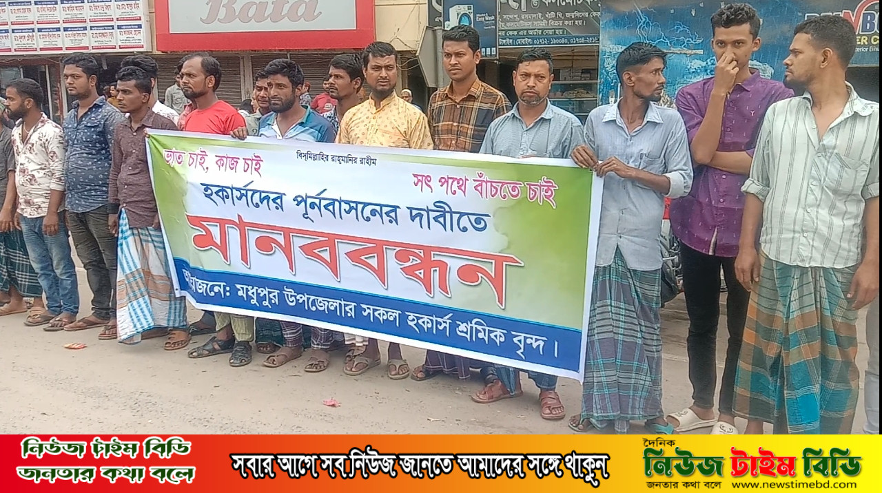 ফুটপাত হকার্সদের পুনর্বাসনের দাবিতে টাঙ্গাইলের মধুপুরে হকার্স বহুমুখী সমবায় সমিতির আয়োজনে মানববন্ধন করেন হকার্স শ্রমিকরা।