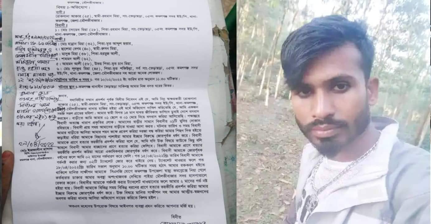 মৌলভীবাজারের কমলগঞ্জ উপজেলার সদর ইউনিয়নের ভেড়াছড়া গ্রামের দুবাই প্রবাসি রহমান মিয়া স্ত্রী রোকসানা আক্তার (২৫) কে নিজ ঘরে জোরপূর্বক ভাবে ধর্ষণ করেছে একই গ্রামের রহমান মিয়া পুত্র মোঃ সোয়েব মিয়া (২৮), মামলার বিবরণে জানা গেছে, আমি একজন সহজ সরল গ্রামের মহিলা। আমার স্বামী বিগত ১৪ মাস যাবত জীবিকার তাগিতে দুবাই দেশে বসবাস করছেন। বাড়িতে আমার ১ছেলে ও ১মেয়ে নিয়ে বসবাস করিয়া আসতেছি। মোঃ সোয়েব মিয়া অত্যান্ত খারাপ প্রকৃতির লোক। আমাদের বাড়ীর সামনে মোঃ সোয়েব মিয়া ১টি মুদি দোকান রয়েছে। মোঃ সোয়েব মিয়া প্রায় সময় আমাদের বাড়ীতে আসা যাওয়া করত। গত ১০ ফেব্রুয়ারি রাত ১১টার দিকে আমার বাড়িতে আসিয়া আমার ইচ্ছা বিরুদ্ধে মোঃ সোয়েব মিয়া জোরপূর্বক ধর্ষণ করে। আমাকে প্রাণে হত্যার ভয়ভীতি প্রদর্শন করিয়া বলে যে, আমি যদি উক্ত বিষয়ে কাউকে কিছু বলি তাহলে আমার বাচ্চাদের হত্যা করে ফেলবে। মোঃ সোয়েব মিয়া আমাকে হত্যার ভয়ভীতি প্রদর্শন করিয়া একাধিক বার জোরপূর্বক ধর্ষণ করে। আমাকে জোরপূর্বক ধর্ষণের ফলে আমি ২মাসের গর্ভধারণ করে ফেলি। গত ১৫ এপ্রিল আমাকে গর্ভনষ্ট করার জন্য ২টি ট্যাবলেট জোর করে খাইয়ে দেয়। ট্যাবলেট খাওয়ার ফলে গত ১৮ এপ্রিল সকাল ১০ঘঠিকার সময় হঠাৎ আমার রক্তক্ষরণ হইতে থাকিলে কমলগঞ্জ উপজেলা স্বাস্থ্য কমপ্লেক্স নিয়ে যাওয়া হলে কর্তব্যরত ডাক্তার আমার অবস্থা আশংকা জনক দেখে কতব্যরত চিকিৎসক মৌলভীবাজার সদর হাসপাতালে রেফার করেন। আমাকে গর্ভনষ্ট করার ট্যাবলেট খাওয়ানোর ফলে আমার ২মাসের গর্ভ নষ্ট হয়ে যায়। গত ২৯ এপ্রিল কমলগঞ্জ থানা (মামলা নং১৯) নারী শিশু নির্যাতন দমন আইনে মামলা দায়ের করা হয়েছে। মোঃ সোয়েব মিয়ার বিরুদ্ধে রয়েছে আরো একাদিক মামলা সেই মামলা গুলোতে বর্তমানে জামিনে আছে সে। এ বিষয়ে কমলগঞ্জ থানার পরিদর্শক (তদন্ত) মোঃ আব্দুর রাজ্জাক সত্যতা নিশ্চিত করে বলেন, পলাতক আসামী মোঃ সোয়েব মিয়া’কে গ্রেপ্তারে বিভিন্ন স্থানে পুলিশি জোর অভিযান চলছে। অতি শীঘ্রই আসামিকে গ্রেপ্তারের আওতায় আনার জন্য তৎপর।