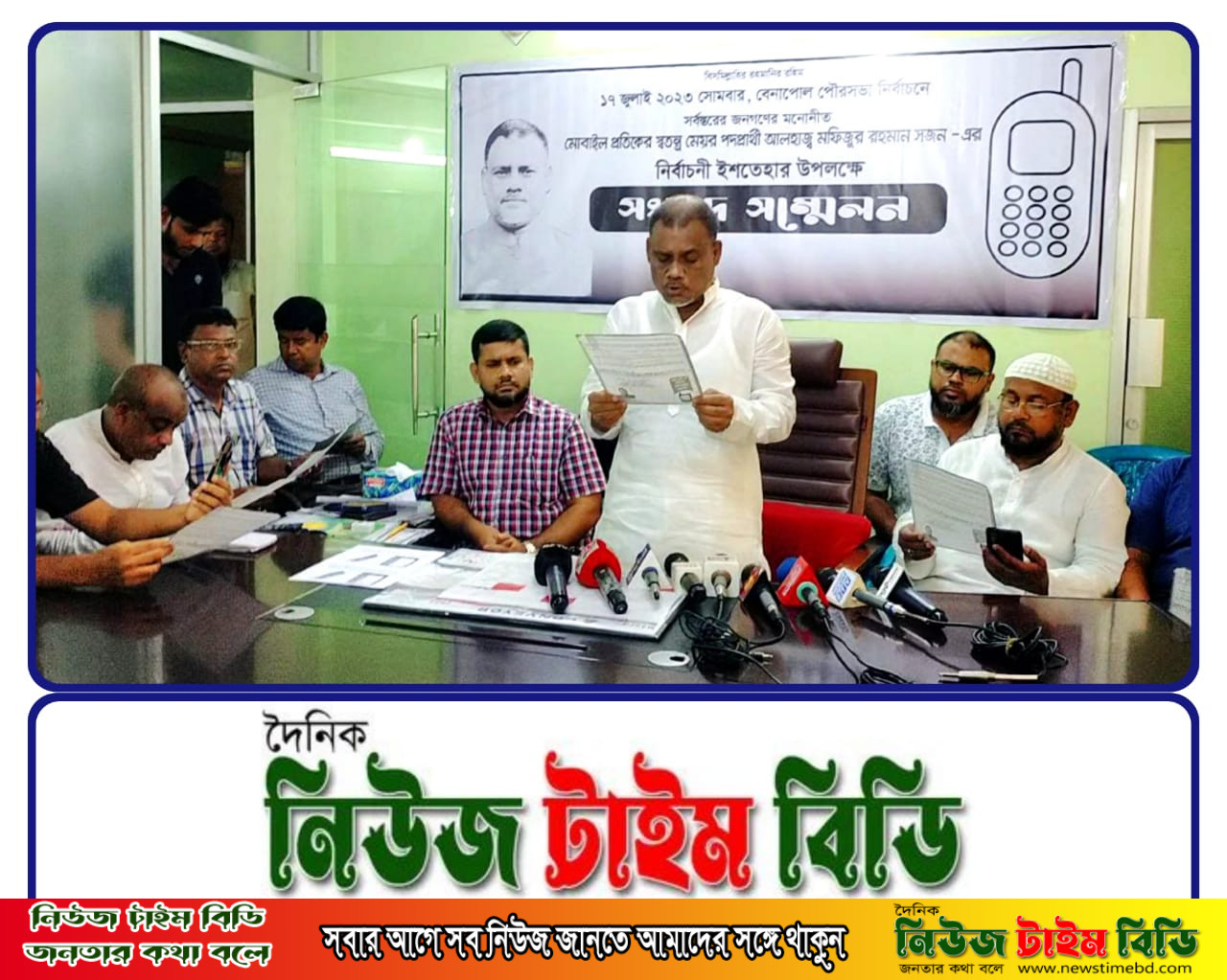 বেনাপোল পৌরসভা নির্বাচনে মোবাইল প্রতীকের স্বতন্ত্র মেয়র প্রার্থী মফিজুর রহমান সজন সংবাদ সম্মেলনের মাধ্যমে নির্বাচনী ইশতেহার ঘোষণা করেছেন। বৃহস্পতিবার দুপুরে মফিজুর রহমান সজনের অফিস কক্ষে এই সংবাদ সম্মেলন অনুষ্ঠিত হয়।