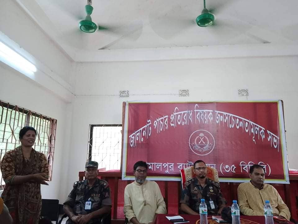 জামালপুর জেলার বকশিগঞ্জের সীমান্তবর্তী ইউনিয়ন ধানুয়া কামালপুরে ১জুন ২০২২ খ্রীঃ রোজ বোধবার জালনোট পাচার প্রতিরোধ বিষয়ক জনসচেতনতামূলক সভা অনুষ্ঠিত হয়েছে। উক্ত সভায় এডি জনাব মোঃ সামসুল হোক (বিজিবি, জামালপুর) এর সভাপতিত্ত্বে প্রধান অতিথি হিসাবে উপস্থিত ছিলেন চেয়ারম্যান জনাব মশিউর রহমান লাকপতি। অন্যান্য অতিথি হিসাবে উপস্থিত ছিলেন মুক্তিযুদ্ধাবৃন্দ, কামালপুর বিজিবি কম্পানী কমান্ডার জনাব সৈয়দ আলী ও বিজিবি সদস্যবৃন্দ। সভায় আরও উপস্থিত ছিলেন জহুরা বেগম, সভাপতি যুব মহিলা লীগ বকশিগঞ্জ উপজেলা শাখা, জনাব ফরহাদ হোসেন ধানুয়া কামালপুর কো-অপারেটিভ উচ্চ বিদ্যালয়, ওমর ফারুক বাবু সদস্য বাংলাদেশ ছাত্রলীগ আহব্বায়ক কমিটি বকশিগঞ্জ উপজেলা শাখা ও এলাকার গণ্যমান্য ব্যক্তিবর্গ। সভায় অতিথিবৃন্দ জালনোট পাচার প্রতিরোধ বিষয়ক জন সচেতনতামূলক গুরুত্বপূর্ণ বক্তব্য রাখেন। উক্ত সভাটি আয়োজনে ছিলেন জামালপুর ব্যাটেলিয়ন (৩৫ বিজিবি)।