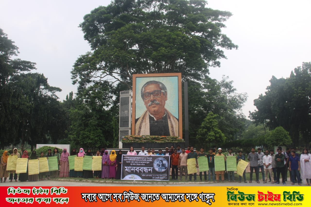 বুধবার (১৬ আগষ্ট) দুপুর ১২টার দিকে বিশ্ববিদ্যালয়ের মৃত্যুঞ্জয়ী মুজিব ম্যুরালের সামনে প্রায় অর্ধশতাধিক শিক্ষার্থী এ মানববন্ধনে অংশ নেয়। এছাড়াও আরও উপস্থিত ছিলেন বিশ্ববিদ্যালয়ের শাপলা ফোরামের সাধারণ সম্পাদক অধ্যাপক ড. মাহবুবর রহমান এবং ঐ শিক্ষার্থীর বিভাগের সভাপতি সহকারী অধ্যাপক সাহিদা আখতার।