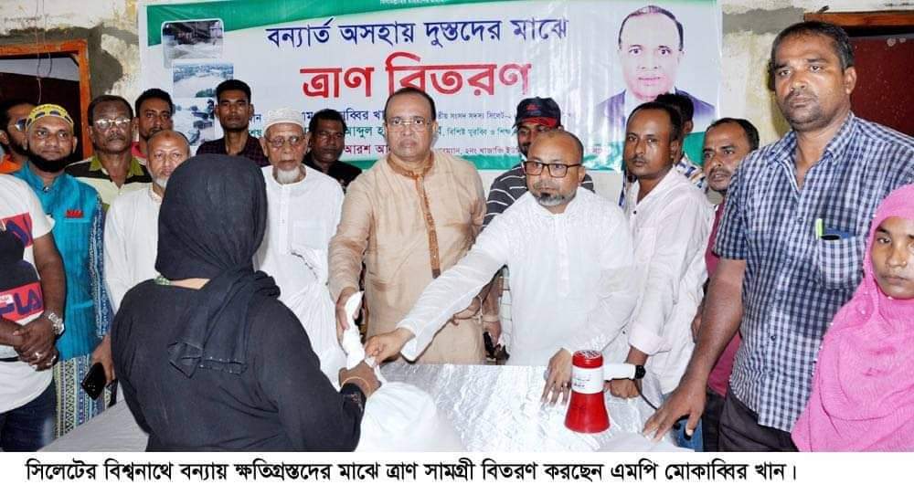 যুক্তরাজ্য থেকে ফিরেই টানা বর্ষণ ও পাহাড়ী ঢলের পানিতে সৃষ্ট আকস্মিক বন্যায় ক্ষতিগ্রস্থ সিলেটের বিশ্বনাথ উপজেলার চার ইউনিয়নের (লামাকাজী, খাজাঞ্চী, অলংকারী, রামপাশা) বন্যার্তদের মধ্যে ত্রাণ বিতরণ করেছেন সিলেট-২ আসনের সংসদ সদস্য ও গণফোরামের নির্বাহী সভাপতি মোকাব্বির খান।