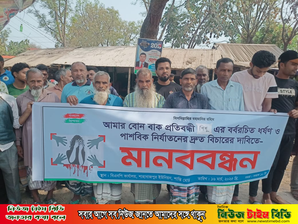 চাঁপাইনবাবগঞ্জের শিবগঞ্জ উপজেলার শাহবাজপুর ইউনিয়নের বাক প্রতিবন্ধী শিশু কে বর্বরচিত ধর্ষণ ও পাশবিক নির্যাতন কারীদের দ্রুত বিচারের দাবিতে মানববন্ধন অনুষ্ঠিত হয়েছে।