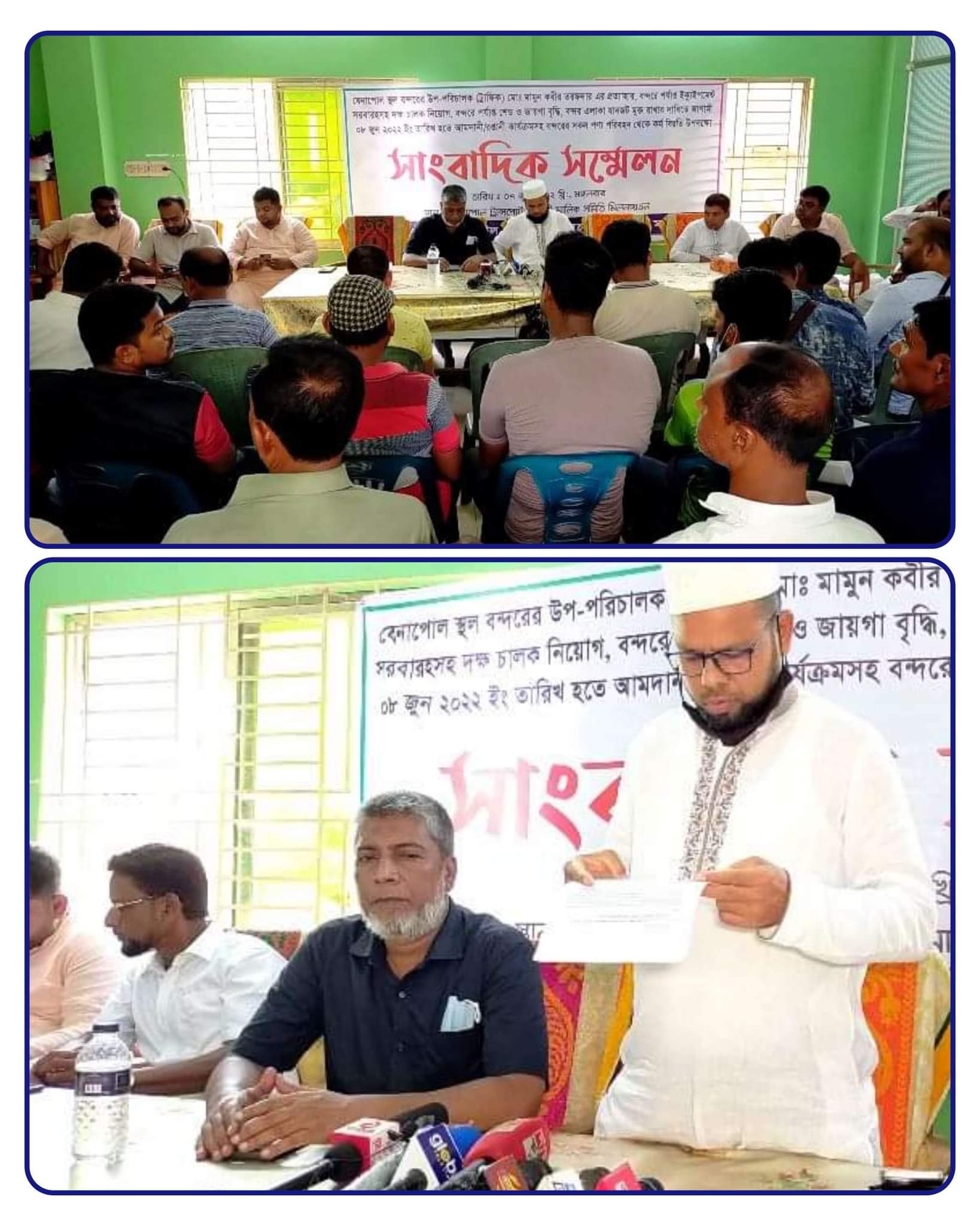 সংবাদ সম্মেলনে এসময় বেনাপোল ট্রান্সপোর্ট এজেন্সি মালিক সমিতির সাধারণ সম্পাদক আজিম উদ্দীন গাজী বলেন, বাংলাদেশের সর্ব বৃহত্তম স্থল বন্দর বেনাপোল। যে বন্দরের মাধ্যমে বাংলাদেশ সরকার প্রতি বছর ৫ হাজার থেকে সাড়ে ৫ হাজার কোটি টাকা রাজস্ব আদায় করে থাকেন। কিন্তু বন্দরে পর্যাপ্ত ইক্যুইপমেন্ট না থাকার কারনে, পণ্য লোড/আলোডের ক্ষেত্রে চরম ভাবে ব্যাহত হচ্ছে। যার ফলে গত ১৬ মে ২০২২ ইং তারিখের মধ্যে বেনাপোল স্থল বন্দরে পর্যাপ্ত ইক্যুইপমেন্ট ব্যবস্থা না করা হলে, ১৭ মে ২০২২ ইং তারিখ হতে বেনাপোল স্থল বন্দরের পণ্য পরিবহন করা হতে বিরত থাকার সিদ্ধান্ত গ্রহন করা হয়। তার প্রেক্ষিতে বেনাপোল স্থল বন্দরের মোঃ মামুন কবীর তরফদার, উপ-পরিচালক (ট্রাফিক)“র” সভাপতিত্বে ইক্যুইপমেন্ট সমস্যা নিরশন সংক্রান্ত সভার স্থানীয় বন্দর ব্যবহারকারী বিভিন্ন সংগঠনের নেতৃবৃন্দের সাথে আলোচনার মাধ্যমে গত ৩১/০৫/২০২২ ইং তারিখের মধ্যে বন্দরে ৩ টি নতুন ক্রেন ও ৩ টি নতুন ফর্কলিফটের সরবারহসহ দক্ষ চালক নিয়োগ দেওয়া হবে মর্মে সিদ্ধান্ত গৃহীত হয়। কিন্তু অদ্যবধি বন্দরে কোন প্রত্যাশিত ইক্যুপমেন্ট সরবারহ করা হয়নি। তার পরেও উক্ত বিষয় সমূহ বন্দর ব্যবহারকারী বিভিন্ন সংগঠনের নেতৃবৃন্দের অবহিত করনের জন্য ০১/০৬/২০২২ ইং তারিখে সভা আহ্বান করতে বন্দর কর্তৃপক্ষকে অনুরোধ করে পত্র প্রেরন করা হয়। পরে গত ০৫/০৬/২০২২ ইং তারিখে বন্দর কর্তৃপক্ষ বিভিন্ন সংগঠনকে নিয়ে আলোচনা সভা আহ্বান করে। উক্ত সভায় পরিচালক (ট্রাফিক) সিদ্ধান্ত জানাবেন বলে অবহিত করেন। কিন্তু বন্দর কর্তৃপক্ষ আমাদেরকে কোন তথ্য সরবারহ করেননি। যার প্রেক্ষিতে নিম্নে উল্লেখিত যৌক্তিক দাবী সমূহ আদায়ের লক্ষে আগামী ০৮/০৬/২০২২ ইং তারিখ হতে বেনাপোল স্থল বন্দর ব্যবহারকারী বিভিন্ন সংগঠনের যৌথ আলোচনার মাধ্যমে আমদানী/ রপ্তানীসহ সকল প্রকার পণ্য পরিবহন করা থেকে কর্মবিরতি পালন করার সিদ্ধান্ত গ্রহন করা হয়েছে।