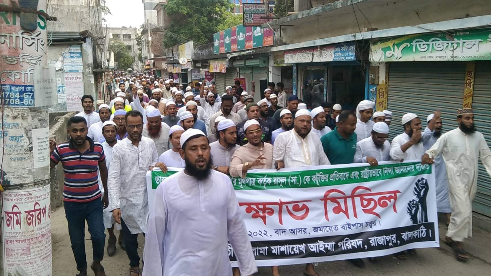ভারতের ক্ষমতাসীন দল বিজেপি’র মূখপাত্র কর্তৃক রাসুল (সাঃ) কে কটূক্তির প্রতিবাদে ও রাষ্ট্রীয় ভাবে নিন্দা জানানোর দাবীতে ঝালকাঠির রাজাপুরে বিক্ষোভ মিছিল ও সমাবেশ অনুষ্ঠিত হয়েছে। আজ শনিবার (১১জুন) বিকাল সাড়ে ৫টার দিকে জাতীয় ওলামা মাশায়েখ আইম্মা পরিষদ উপজেলা শাখার আয়োজনে উপজেলা সদরের বাইপাস মোড় চত্তরে থেকে বিক্ষোভ মিছিল বের হয়ে উপজেলার প্রধান প্রধান সড়ক প্রদক্ষিন করে। বিক্ষোভ মিছিলে দলমত নির্বিশেষে সকল পেশার মানুষ অংশগ্রহন করেন। মিছিল শেষে বাইপাস মোড় চত্তওে সমাবেশ অনুষ্ঠিত হয়। এ সময় সমাবেশে বক্তব্য রাখেন জাতীয় ওলামা মাশায়েখ আইম্মা পরিষদ উপজেলা শাখার সভাপতি মাওলানা আসাদুজ্জামান, সহ-সভপতি মাওলানা আল-আমিন দোহারী, সাধারণ সম্পাদক মাওলানা রফিকুল ইসলাম, উপদেষ্টা ক্বারী মো. বেলাছেু হোসেন, ইসলামি যুব আন্দোলনের কেন্দ্রীয় কমিটির সহ-সাংগঠনিক সম্পাদক প্রভাষক আল-আমিন, উপজেলা ইসলামি আন্দোলনের সহ-সভাপতি ক্বারী তাওহিদুল ইসলাম, সাধারণ সম্পাদক ইব্রাহীম আলহাদী প্রমূখ।