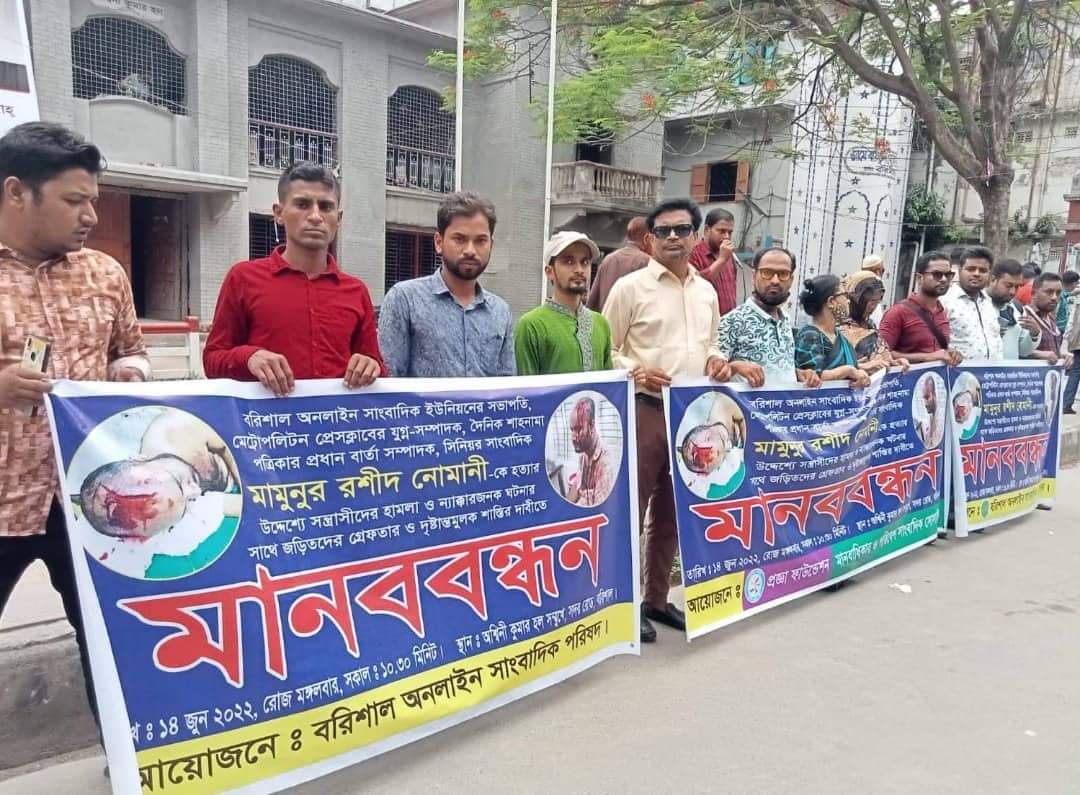 বরিশাল অনলাইন সাংবাদিক ইউনিয়নের সভাপতি, বরিশাল মেট্রোপলিটন প্রেসক্লাবের যুগ্ন সম্পাদক, দৈনিক শাহনামার প্রধান বার্তা সম্পাদক , বরিশাল খবরের সম্পাদক, সিনিয়র সাংবাদিক মামুনুর রশীদ নোমানীর উপর হামলাকারীদের অনতিবিলম্বে গ্রেফতার ও দায়ীদের বিচারের দাবিতে মানবাধিকার ও পরিবেশ সাংবাদিক সোসাইটির উদ্যোগে এক প্রতিবাদী মানববন্ধন অনুষ্ঠিত হয়েছে।