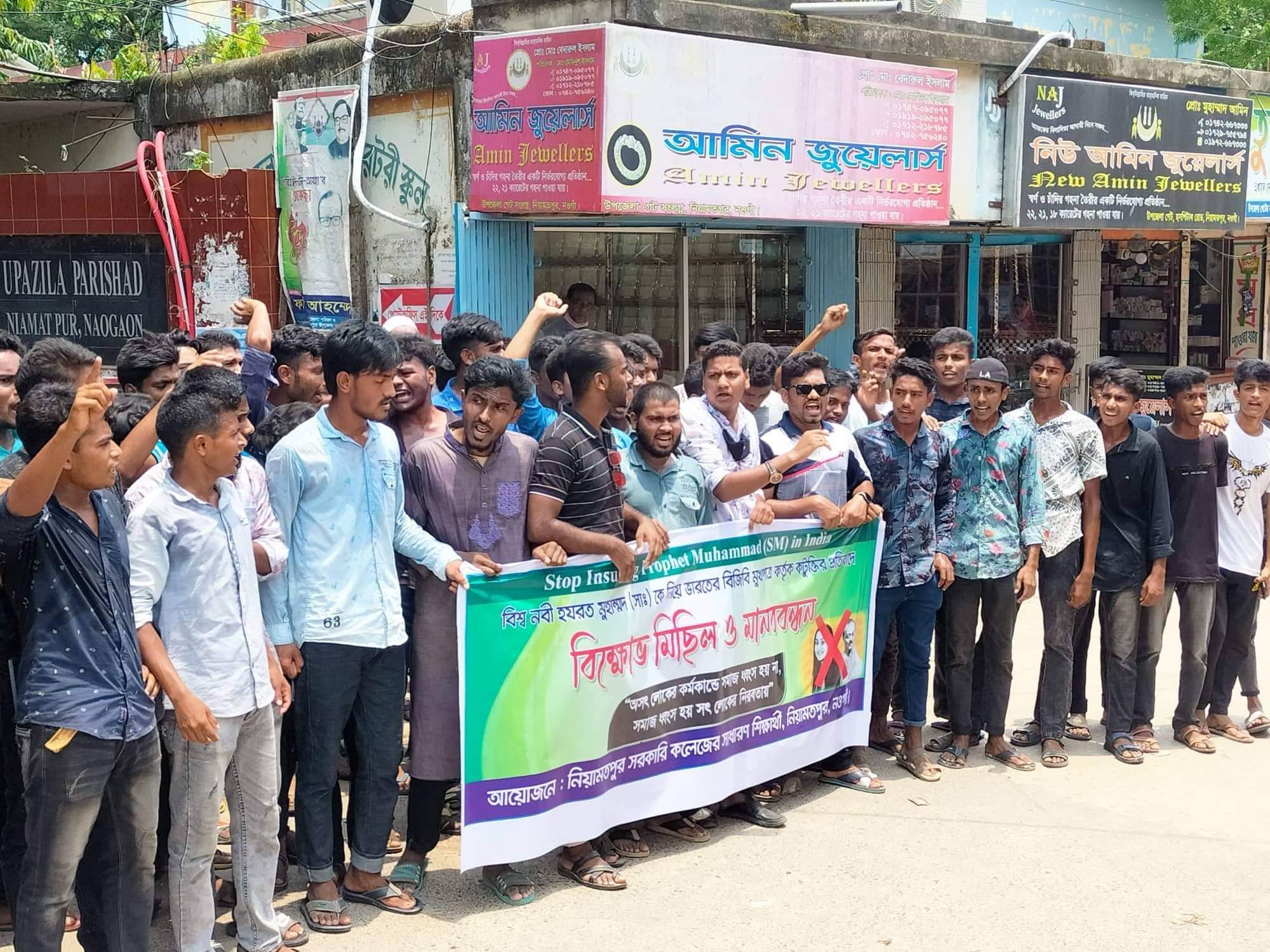 “অসৎ লোকের কর্মকাণ্ডে সমাজ ধ্বংস হয় না, সমাজ ধ্বংস হয় সৎ লোকের নীরবতায় ” স্লোগানকে সামনে রেখে নওগাঁর নিয়ামতপুরে বিশ্বনবী হযরত মুহাম্মদ (সা) কে নিয়ে ভারতের নরেন্দ্র মোদি সরকার দলের মুখপাত্র নুপুর শর্মার কটুক্তি প্রতিবাদে নিয়ামতপুর সরকারি কলেজের সাধারণ শিক্ষার্থীদের বিক্ষোভ মিছিল ও মানববন্ধন অনুষ্ঠিত হয়েছে। মঙ্গলবার ১২ টার দিকে সরকারি কলেজ থেকে বিক্ষোভ মিছিল শুরু হয়ে উপজেলা সদরের গুরুত্বপূর্ণ সড়ক প্রদক্ষিণ করে উপজেলা পরিষদ চত্বরে মানববন্ধনে অংশগ্রহণ করে শিক্ষার্থীরা। মানববন্ধনে অংশ নেওয়া শিক্ষার্থীরা।