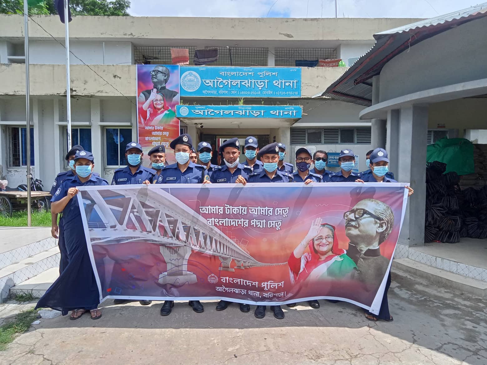 আমার টাকায় আমার সেতু বাংলাদেশের পদ্মা সেতু ।এই শ্লোগানকে সামনে রেখে পদ্মা সেতুর উদ্বোধন উপলক্ষে সারা বাংলাদেশের আনন্দের ভাগীদার আগৈলঝাড়া থানা পুলিশের পক্ষ থেকে এক আনন্দ শোভাযাত্রা অনুষ্ঠিত হয়েছে। থানা পুলিশ পরিদর্শক (ওসি তদন্ত) জনাব মাজহারুল ইসলাম সুমন সাহেবের নেতৃত্বে আনন্দ শোভাযাত্রাটি উপজেলার বিভিন্ন সড়ক মহাসড়ক প্রদক্ষিণ শেষে থানার গোল ঘরের সামনের শেষ হয়। আনন্দ শোভাযাত্রায় উপস্থিত ছিলেন থানা সেকেন্ড অফিসার চৌকস পুলিশ কর্মকর্তা উপ-পরিদর্শক জনাব মনিরুজ্জামান, চৌকস পুলিশ কর্মকর্তা এস আই আলী হোসেন, এসআই মিজানুর রহমান, এএসআই সোহাগ, এএসআই রফিকুল ইসলাম, এএসআই গৌরাঙ্গ, এএস আই মিতা সেন। এছাড়াও অন্যান্য কর্মকর্তা ও পুলিশ সদস্য আনন্দ শোভাযাত্রা উপস্থিত ছিলেন। আনন্দ শোভাযাত্রা শেষে থানার পক্ষ থেকে সবাইকে মিষ্টিমুখ করানো হয়।