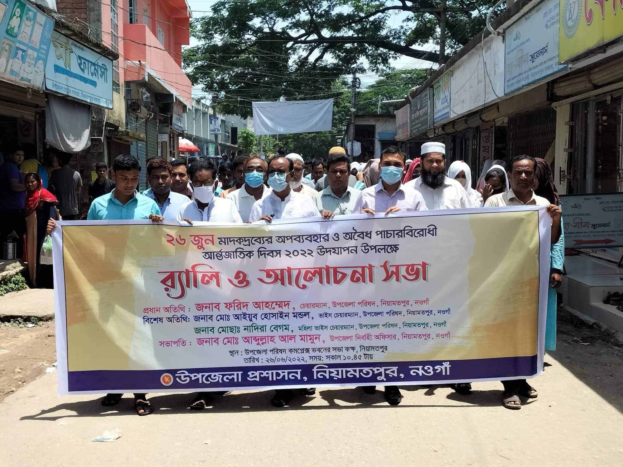 নওগাঁর নিয়ামতপুরে মাদকদ্রব্যের অপব্যবহার ও অবৈধ পাচারবিরোধী আন্তর্জাতিক দিবস উদযাপন উপলক্ষে র্যালী ও আলোচনা সভা অনুষ্ঠিত হয়েছে। রবিবার (২৬ জুন) সকাল ১১ ঘটিকায় উপজেলা প্রশাসনের আয়োজনে উপজেলা পরিষদ চত্বর থেকে র্যালী শুরু হয়ে গুরুত্বপূর্ণ সড়ক প্রদক্ষিণ করে উপজেলা পরিষদ মিলনায়তনে আলোচনা সভা অনুষ্ঠিত হয়। উপজেলা নির্বাহী কর্মকর্তা (ইউএনও) আব্দুল্লাহ আল মামুনের সভাপতিত্বে প্রধান অতিথি হিসেবে উপস্থিত ছিলেন উপজেলা পরিষদ চেয়ারম্যান ফরিদ আহম্মেদ। এ সময় আরও উপস্থিত ছিলেন উপজেলা পরিষদ ভাইস চেয়ারম্যান আইয়ুব হোসাইন মন্ডল, উপজেলা মহিলা ভাইস চেয়ারম্যান নাদিরা বেগম, মাধ্যমিক শিক্ষা অফিসার আব্দুস সালাম, সদর ইউপি চেয়ারম্যান বজলুর রহমান নঈম, প্রেসক্লাবের সভাপতি শাহজাহান শাজু প্রমূখ। আলোচনা সভায় বক্তারা মাদকদ্রব্যের অপব্যবহার নিয়ে দিকনির্দেশনামূলক বক্তব্য রাখেন।