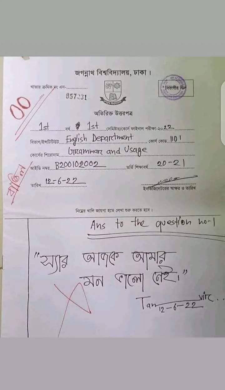 পরীক্ষার অতিরিক্ত উত্তরপত্রে ‘স্যার আজকে আমার মন ভালো নেই’ লিখে সামাজিক যোগাযোগমাধ্যমে ভাইরাল হয়েছেন জগন্নাথ বিশ্ববিদ্যালয়ের (জবি) এক শিক্ষার্থী। বিষয়টি নিয়ে ইতোমধ্যে বিশ্ববিদ্যালয়ে হাসিঠাট্টায় পরিণত হয়েছে। উত্তরপত্রে ‘মন ভালো নেই’ লেখা জগন্নাথ বিশ্ববিদ্যালয়ের (জবি) সেই শিক্ষার্থীর তদন্ত সাপেক্ষে ব্যবস্থা নিবেন বলে জানিয়েছেন জগন্নাথ বিশ্ববিদ্যালয় প্রশাসন। গত বৃহস্পতিবার ইংরেজি বিভাগের প্রথম সেমিস্টারের এক শিক্ষার্থীর অতিরিক্ত উত্তরপত্রের প্রথম পৃষ্ঠার ছবি ফেসবুকে ছড়িয়ে পড়ে। উত্তরপত্রে ওই শিক্ষার্থী লেখেন ‘স্যার আজকে আমার মন ভালো নেই’। রোববার ইংরেজি বিভাগের শৃঙ্খলা কমিটির মাধ্যমে ওই শিক্ষার্থীকে তলব করেন। পরবর্তীতে ওই শিক্ষার্থীর অপরাধ ও লিখিত বক্তব্য বিশ্ববিদ্যালয় প্রশাসন প্রক্টর দপ্তর বরাবর জমা দেয় ইংরেজি বিভাগ। এ বিষয়ে ইংরেজি বিভাগের শিক্ষক অধ্যাপক ড. মো.মোমিন উদ্দীন বলেন, ‘নিশ্চয়ই এটি একটি অপরাধ যা আইনশৃঙ্খলার বিষয়। আমরা ওই ছেলেকে ডেকে তার বক্তব্য নিয়েছি এবং বিশ্ববিদ্যালয় প্রশাসন বরাবর পাঠিয়েছি। বাকিটা বিশ্ববিদ্যালয় প্রশাসন সিদ্ধান্ত নেবেন।’ বিশ্ববিদ্যালয়ের প্রক্টর অধ্যাপক ড.মোস্তফা কামাল বলেন, ‘বিভাগ থেকে আমরা কাগজ পেয়েছি। বিষয়টি তদন্ত সাপেক্ষে সত্যতা যাচাইয়ের মাধ্যমে ব্যবস্থা নেওয়া হবে।’ উল্লেখ্য, আস্কে (আজকে) আমার মন ভালো নেই এটি চিটাইংগে টিভি কর্তৃক প্রচারিত ভাইরাল কথোপকথন।