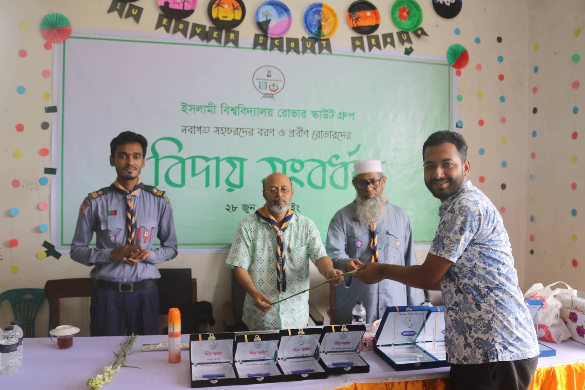ইসলামী বিশ্ববিদ্যালয়(ইবি) রোভার স্কাউট গ্রুপের আয়োজনে নবীন বরণ ও প্রবীণ বিদায়সংবর্ধনা অনুষ্ঠিত হয়েছে। মঙ্গলবার (২৮ জুন) সকাল ১২ টায় বীরশ্রেষ্ঠ হামিদুর রহমান মিলনায়নের( টিএসসিসি) ৩য় তলার করিডোরে অনুষ্ঠানের আয়োজন করা হয়। এসময় উপস্থিত ছিলেন রোভার স্কাউট গ্রুপের সম্পাদক অধ্যাপক ড.রুহুল কে এম সালেহ, আর এস এল অধ্যাপক ড. মো: কামরুল হাসান, অধ্যাপক ড. মো: আমিনুল ইসলাম। এ সময় আরো উপস্থিত ছিলেন ইবি রোভার স্কাউট গ্রুপের সিনিয়র রোভারমেট ও ইউনিট কাউন্সিল সভাপতি আখতার হ আজাদ, ইউনিট কাউন্সিল সাধারণ সম্পাদক মুসা হাশেমী এবং রোভার স্কাউট সদস্যবৃন্দ। ইবি রোভার স্কাউট গ্রুপের আর. এস. এল অধ্যাপক ড. আমিনুল ইসলাম বলেন, বিশ্ববিদ্যালয়ের ইতিহাসে এই প্রথমবার কোনো রোভার ‘ন্যাশনাল সার্ভিস অ্যাওয়ার্ড’ অর্জন করেছে। এটি অত্যন্ত আনন্দের এবং ইবি রোভার স্কাউট গ্রুপ ও বিশ্ববিদ্যালয়ের জন্য গর্বের। ওয়ালিউল্লাহ প্রমাণ করেছে, ইবির রোভাররা এখন অনেক এগিয়ে। রোভারদের এমন সাফল্যের ধারাবাহিতা অব্যাহত থাকুক এটাই কামনা করি। সকল নবীন সদস্যদের জন্য রইলো শুভকামনা। এর আগে, রোভার স্কাউট গ্রুপের নতুন সদস্যদের ফুল দিয়ে বরণ করা হয় এবং প্রবীনদের ক্রেস্ট প্রদান করা হয়। একই সাথে নতুন কমিটি ঘোষণা করা হয়। এ বছর উদয়ীমান ৩ জন এবং বিশেষ আবদানের জন্য ২ জন রোভার সদস্যকে পুরস্কারে ভূষিত করা হয়। সবশেষে সাংস্কৃতিক অনুষ্ঠান পরিবেশনের মাধ্যামে অনুষ্ঠান শেষ হয়।