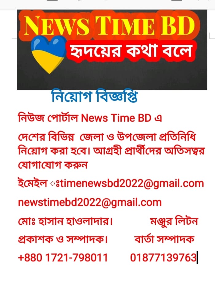 জনবহুল নিউজ পোর্টাল “ নিউজ টাইম বিডি” বাংলাদেশের প্রতি জেলা উপজেলায় শুন্য পদে প্রতিনিধি নিয়োগ দেওয়া হবে। আগ্রহি প্রার্থি গন যোগাযোগ করুন । মঞ্জুর লিটন- বার্তা সম্পাদক 01877139763 ও মোঃ হাসান হাওলাদার প্রকাশক ও সম্পাদক -মোবাইল 01721798011