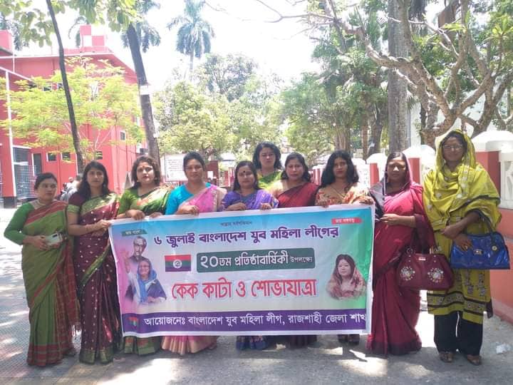 রাজশাহীতে নানা আয়োজনের মধ্যে দিয়ে বাংলাদেশ যুব মহিলা লীগের ২০তম প্রতিষ্ঠা বার্ষিকী পালন করা হয়েছে। রাজশাহী জেলা যুব মহিলা লীগের আয়োজনে বুধবার ( ৬ জুলাই) সকাল ৭টায় রাজশাহী কলেজে বঙ্গবন্ধুর প্রতিকৃতিতে ফুল দিয়ে শ্রদ্ধা নিবেদনের পর কেক কেটা শেষে জেলা যুব মহিলালীগের সাধারণ সম্পাদক বিপাশা খাতুনের নেতৃত্বে একটি শোভাযাত্রা বের করেন উপস্থিত জেলার নেত্রীরা। এরপর দুপুরে বাঘা উপজেলার গড়গড়ি ইউনিয়নের “সরেরহাট কল্যানী শিশুসনদ ও মমতাজ-আজিজ বৃদ্ধা নিকেতন” এর অসহায় এতিম শিশু ও বৃদ্ধাদের মাঝে মিষ্টি ও খাবার বিতরণ করেন সংগঠনটির জেলার সাধারণ সম্পাদক বিপাশা খাতুন। এ সময় উপস্থিত ছিলেন, বাঘা উপজেলা আওয়ামী লীগের সাধারন সম্পাদক আশরাফুল ইসলাম বাবুল, গড়গড়ী ইউনিয়ন আওয়ামী লীগের সভাপতি অধ্যক্ষ আনিসুল রহমান ও সাধারণ সম্পাদক গড়গড়ী ইউনিয়ন চেয়ারম্যান রবিউল ইসলামসহ বিভিন্ন উপজেলা ও ইউনিয়ন থেকে আগত যুব মহিলা লীগের নেত্রীবৃন্দরা।