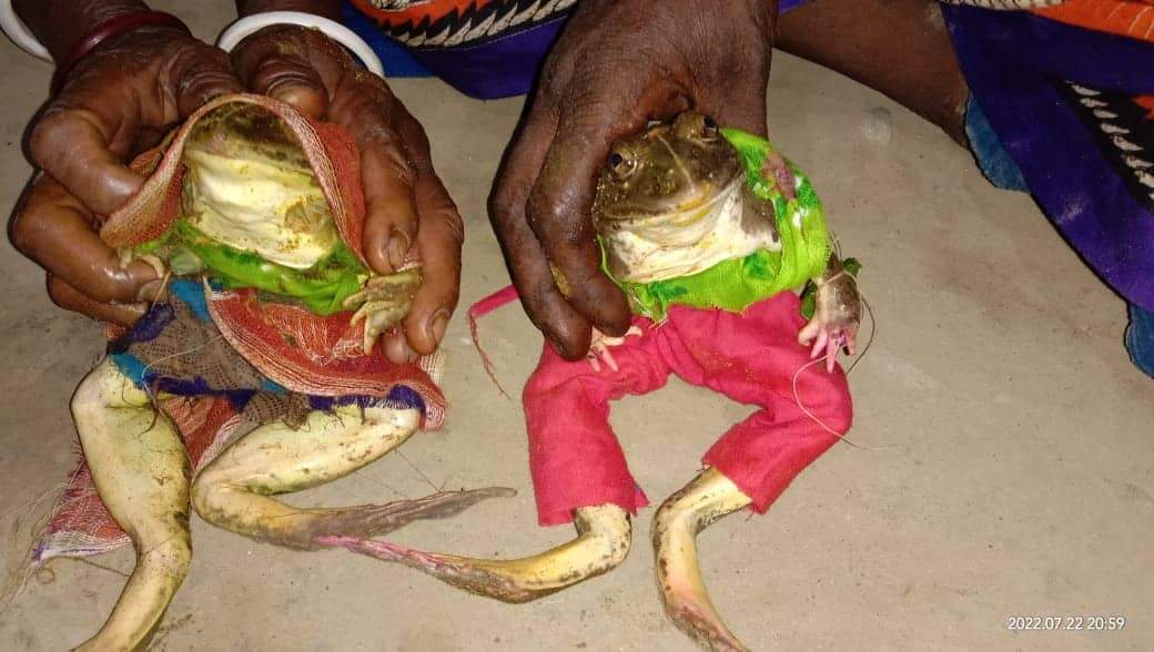 বাংলাদেশে চলছে এখন বর্ষাকাল। বর্ষায় বৃষ্টির ঝনঝন শব্দে গ্রামের টিনের চালাগুলো মুখরিত হয়ে ওঠে। এ সময় খাল-বিল পানিতে ভরে যায়। গ্রামের ছেলে-মেয়েরা খাল-বিলে মাছ ধরতে গিয়ে কতোই না হইচই করে। ছেলে-মেয়েদের সেই হইচই এখন নেই। বৃষ্টির পানির অভাবে যেখানে খাল-বিল শুকিয়ে ফেটে গেছে, কৃষকরা আমন ধানের চারা রোপণই করতে পারছে না মাঠে, সেখানে খাল-বিলে মাছ ধরা শুধুই কাল্পনিক। বৃষ্টির জন্য অনেকে বিভিন্ন ধরনের পন্থা অবলম্বন করছেন। কেউ নামাজ আদায় করছে, কেউ আবার ব্যাঙ বিয়ের আয়োজন করছেন। ক্যালেন্ডারের পাতা বলছে আষাঢ় মাস শেষ হয়ে পার হতে চলল শ্রাবণের প্রথম সপ্তাহও। কিন্তু দেখা নেই বৃষ্টির। এই অবস্থায় বৃষ্টির আশায় গ্রাম বাংলার প্রাচীন রীতিপালন করে নওগাঁ জেলার নিয়ামতপুর উপজেলার চন্দননগর ইউনিয়নের জয়পুর গ্রামের সনাতন ধর্মাবলম্বীরা অভিনব ভাবে ব্যাঙের বিয়ের ব্যবস্থা গ্রহণ করলেন। শুক্রবার (২২ জুলাই) সকাল থেকে রাত ১০ টা পর্যন্ত রং মেখে নেচে গেয়ে চলে বিয়ের অনুষ্ঠান। ব্যাঙ বর ও কনের বিয়ে পড়ান স্থানীয় পুরোহিত শ্রী বৈশাখ পাহান। আয়োজকেরা জানান, জনশ্রুতি রয়েছে ব্যাঙের বিয়ে দিলে বৃষ্টি হয়। আর সেই কারণে গ্রামের সনাতন ধর্মাবলম্বীরা অভিনব ভাবে এই বিয়ের ব্যবস্থা গ্রহণ করেন। ক্যালেন্ডারের পাতা বলছে আষাঢ় মাস শেষ হয়ে পার হতে চলল শ্রাবণের প্রথম সপ্তাহও। কিন্তু রোপা আমন ধান চাষ করার মত পর্যাপ্ত পানি জমিতে নেই, এবং অনাবৃষ্টির ও খরার কারণে কৃত্রিম ভাবে জমিতে পানি দিয়ে পানি ধরে রাখা সম্ভব হচ্ছে না। যে জমি গুলোতে চারা রোপণ করা হয়েছে, সে জমিগুলো পানির অভাবে ফেটে চৌচির হয়ে গেছে। অনাবৃষ্টির হাত থেকে মুক্তি পেতে ব্যাঙের বিয়ের আয়োজন করা হয়। পুরোহিত বৈশাখ পাহান বলেন, ‘অনাবৃষ্টি ও খরা থেকে মুক্তি পেতে প্রথমে শিশুরা এই ব্যাঙের বিয়ের উদ্যোগ গ্রহণ করলেও তা পরে উৎসবে রূপ নেয়। বড়রাও এ উৎসবে যোগ দেন। আমাদের বিশ্বাস এই ব্যাঙের বিয়ের মধ্য দিয়ে অনাবৃষ্টি ও খরা কেটে যাবে। স্থানীয় বাসিন্দা বৈশাখ পাহান বলেন, অতীতেও এভাবে ব্যাঙের বিয়ে দেওয়ার পর জলের দেখা মিলে ছিল। এবারও সে আশা থেকেই এই আয়োজন করা হয়েছে। গতবার ব্যাঙের বিয়ের দিন দুপুর থেকেই বৃষ্টি হয়েছিল।’ এ বিষয়ে ব্যাঙ বরের মা প্রতিমা বলেন, অনেক বছর ধরে দেখে আসছি অনাবৃষ্টি হলেই এই গ্রামের সবাই মিলে ব্যাঙের বিয়ের আয়োজন করে। অনেক সময় বৃষ্টিও হয়েছে। তাই মানুষের কাছে এক প্রকার বিশ্বাস হয়ে গেছে, ব্যাঙের বিয়ে দিলেই বৃষ্টি হবে। সেই আশাতেই ব্যাঙের বিয়ে দিয়ে ভগবানের কাছে বৃষ্টি প্রার্থনা করতেছি।