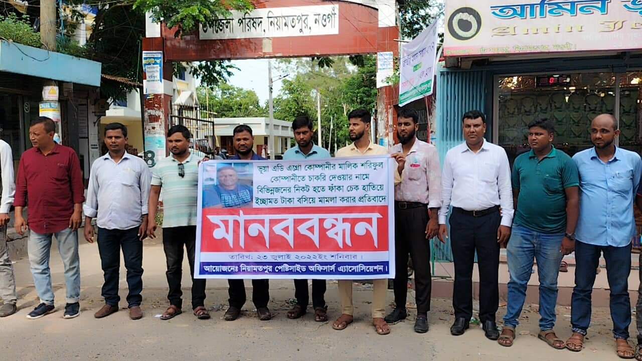 নওগাঁর নিয়ামতপুরে ভূয়া এডি এগ্রো কোম্পানির মালিক শরিফুল ইসলাম কোম্পানিতে চাকরি দেওয়ার নামে বিভিন্ন জনের নিকট থেকে ফাঁকা চেক হাতিয়ে নিয়ে ইচ্ছেমত টাকা বসিয়ে মামলা করার প্রতিবাদে মানববন্ধন অনুষ্ঠিত হয়েছে। শনিবার বিকেল ৪ ঘটিকায় উপজেলা পরিষদের সামনে নিয়ামতপুর পোষ্টিসাইড অফিসার্স এ্যাসোসিয়েশন মানববন্ধনের আয়োজন করে। মানববন্ধনে বক্তব্য রাখেন, এডি কোম্পানিতে ভূয়া নিয়োগ পাওয়া উপজেলার শ্রীমন্তপুর ইউনিয়নের রামনগর গ্রামের মৃত আবু বক্করের ছেলে শরিফুল ইসলাম। তিনি বলেন, বিগত দুই বছর আগে আমাদের নিয়োগ দেওয়ার সময় ফাঁকা চেক নেয়। চাকরি শুরুর পর যে সমস্ত কীটনাশক পণ্য দেয় তার কোন গুনগত মান না থাকায় সেগুলো মার্কেটে না চলায় হিসাব বুঝিয়ে চাকরি ছেড়ে দিলে এডি কোম্পানির মালিক শরিফুল ইসলাম চেক দিতে অনীহা প্রকাশ করেন। শুধু আমার কাছ থেকেই নয় দেশের বিভিন্ন উপজেলা থেকে তিনি প্রতিনিধি নিয়োগের মাধ্যমে ফাঁকা চেক হাতিয়ে নেন এবং চেকে ইচ্ছেমত টাকার অংক বসিয়ে মামলা দায়ের করেন। এডি কোম্পানির মালিক শরিফুল ইসলাম পাবনা জেলার ঈশ্বরদী উপজেলার শেখের দাইড় গ্রামের আফসার আলীর ছেলে। মানববন্ধনে আরও বক্তব্য রাখেন, নিমপেক্স কোম্পানির সিনিয়র মার্কেটিং অফিসার ইউনুস আলী, উইন এগ্রো কোম্পানির সিনিয়র মার্কেটিং অফিসার সাকিব হাসান শুভ প্রমূখ। চেক জালিয়াতির বিষয়ে জানতে চাইলে এডি এগ্রো কোম্পানির মালিক শরিফুল ইসলাম বলেন, আমার কোম্পানিতে চাকরি করার সময় বকেয়া রাখার কারনে শরিফুলের বিরুদ্ধে ৩৬ লক্ষ টাকার চেক মামলা দেওয়া হয়েছে।