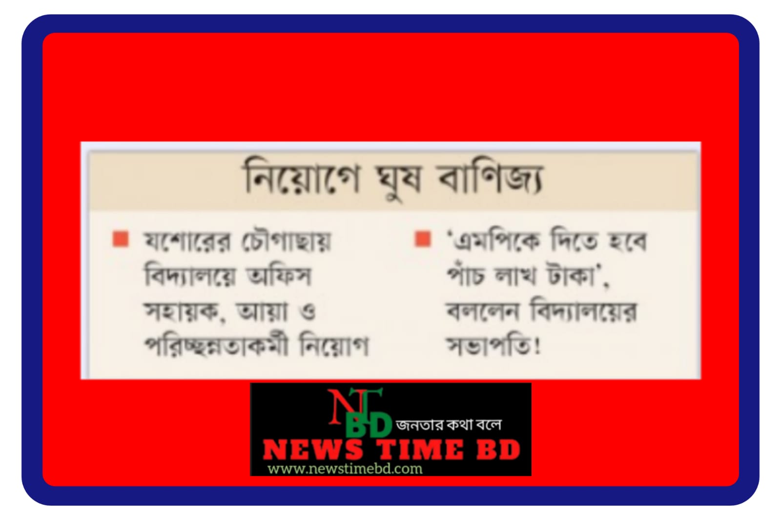 যশোরের চৌগাছার মুক্তিনগর মাধ্যমিক বিদ্যালয়ে অফিস সহায়ক, আয়া ও পরিচ্ছন্নতাকর্মীর তিনটি শূন্য পদে নিয়োগের জন্য চূড়ান্ত তিন প্রার্থীর কাছ থেকে ২১ লাখ ৬০ হাজার টাকা নেওয়ার অভিযোগ পাওয়া গেছে। গতকাল বুধবার এই টাকা নেওয়া হয়। এর আগে সকালে বিদ্যালয়ের ম্যানেজিং কমিটির সভায় কোন পদে কত টাকা নেওয়া হবে তা নির্ধারণ করা হয়। এ ছাড়া নিয়োগসংক্রান্ত ম্যানেজিং কমিটির সভায় প্রতিষ্ঠানের সভাপতি হাসিনুর রহমান বলেন, ওই টাকা থেকে স্থানীয় সংসদ সদস্যকেই (এমপি) দিতে হবে পাঁচ লাখ। এ ঘটনায় সভায় উপস্থিত অন্য সদস্যরা ক্ষোভ প্রকাশ করেন।