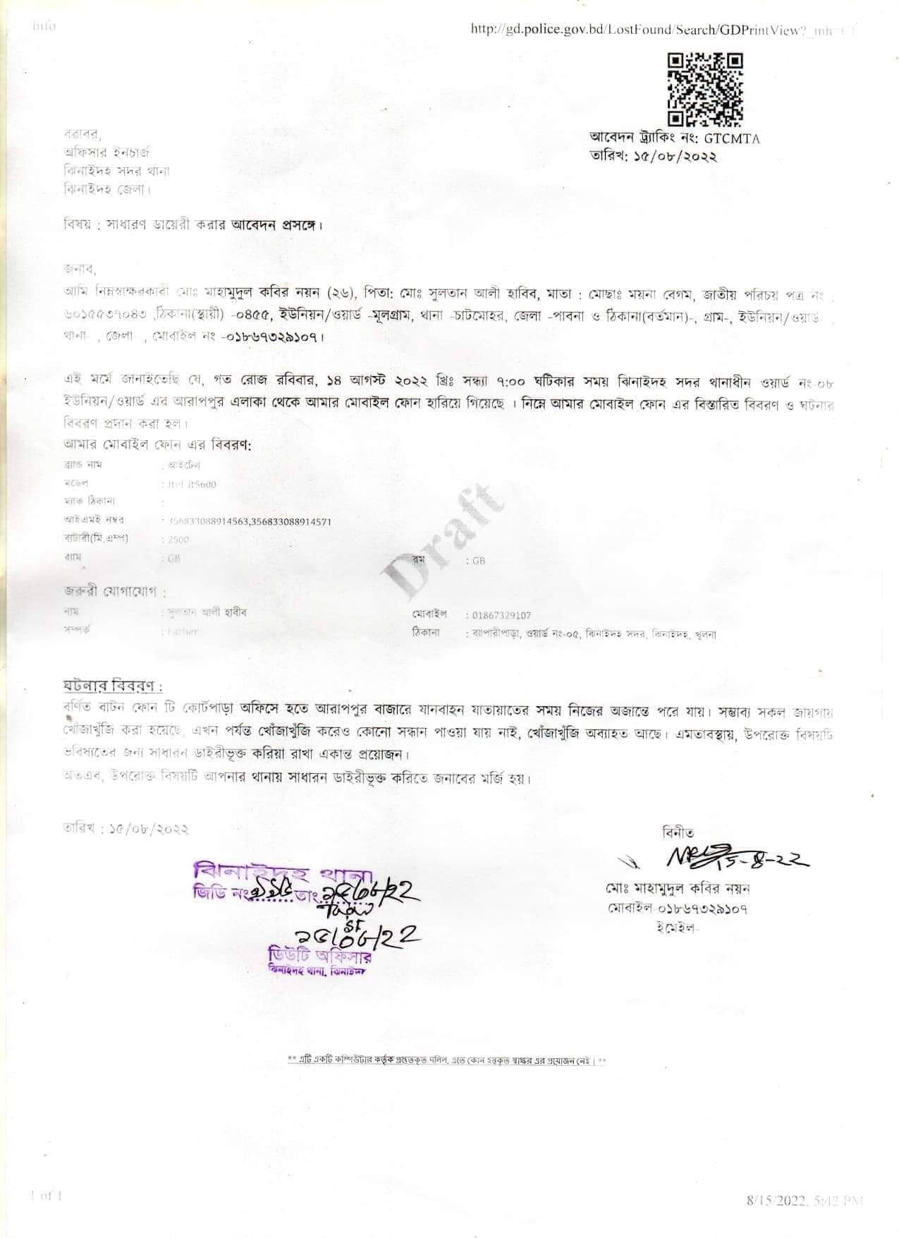 ইং১৪ই আগষ্ট আনুমানিক সন্ধ্যা ৬টার দিকে ঝিনাইদহ জেলার সদর উপজেলা শহরে ব্যাক্তিগত কাজের উদ্দেশ্য আরাপপুর বাস স্যান্ড যানবাহন যাতায়াতের সময় নিজের অজান্তে আমার ব্যাবহিত মোবাইল ফোনটি পড়ে যায়।পরবর্তিত্তে অনেক খোঁজাখুঁজি করেও