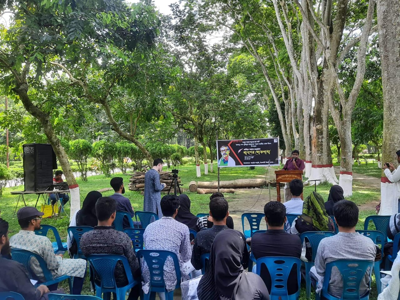 অনুষ্ঠানে আবৃত্তি আবৃত্তির সভাপতি নুরুল্লাহ মেহেদী সভাপতিত্বে এবং বাংলা বিভাগের শিক্ষার্থী নিরব বিশ্বাস ও ফোকলোর স্টাডিজ বিভাগের শিক্ষার্থী সামিহা খানের সঞ্চালনায় অনুষ্ঠানে সম্মানিত অতিথি হিসেবে উপস্থিত ছিলেন বায়োটেকনোলজি অ্যান্ড জেনেটিক ইঞ্জিনিয়ারিং বিভাগের অধ্যাপক ড. মোঃ আবু হেনা মোস্তফা জামাল।