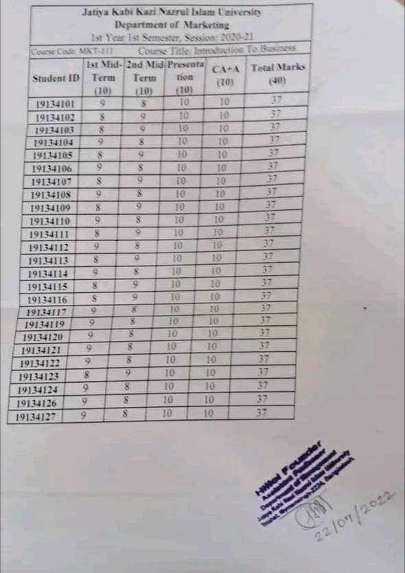 বিশ্ববিদ্যালয় সূত্রে জানা যায়, মার্কেটিং বিভাগের ২০২০-২১ শিক্ষাবর্ষের ‘ইন্ট্রোডাকশন টু বিজনেস’ (কোর্স কোড-১১১) কোর্সটির কোর্স শিক্ষক ছিলেন ব্যবস্থাপনা বিভাগের শিক্ষক হিল্লোল ফৌজদার। এই কোর্সের ইন্টার্নাল সর্বমোট ৪০ নম্বরের মধ্যে সর্বমোট ২৭ জন শিক্ষার্থীকেই সমান ৩৭ নম্বর করে প্রদান করেছেন তিনি।