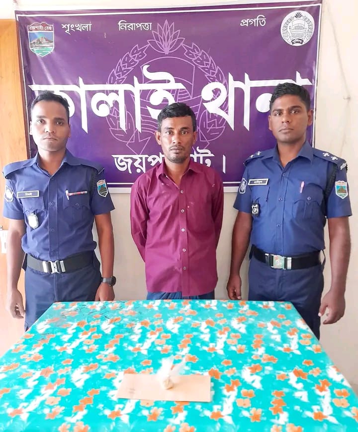 কালাই থানা পুলিশের বিশেষ অভিযানে এসআই(নিঃ)/ মোঃ আল ইমরান, সংঙ্গীয় অফিসার এএসআই (নিঃ) মোঃ মাসুদ রানা, সঙ্গীয় এএসআই (নিঃ) মোঃ বুলবুল আহম্মেদ, এএসআই (নিঃ), সালেক আহমেদ, কং/৩২৩ প্রহলাদ উরাও, কং/৪৫১ মোঃ আব্দুল আহাদ, কং/৫২৬ মোঃ নিজাম খান, সকলেই কালাই থানা, জেলা- জয়পুরহাট ০৯/০৯/২০২২ খ্রিঃ তারিখ ২৩.৪৫ ঘটিকার সময় কালাই থানাধীন উত্তর তেলিহার গ্রামস্থ জনৈক মোঃ গোফফার আলী এর বসত বাড়ীর বারান্দা হইতে আসামী ১। মোঃ গোফফার আলী (৩৭), পিতা- মোঃ কোরবান, সাং- উত্তর তেলিহার, থানা- কালাই, জেলা-জয়পুরহাট’কে ০১ (এক) গ্রাম হেরোইন, মূল্য অনুমান ৩,০০০/- (তিন হাজার) টাকা সহ গ্রেফতার পূর্বক কালাই থানার মামলা নং- ০৬, তারিখ- ১০/০৯/২০২২ খ্র্রিঃ, ধারা- ২০১৮ সালের মাদক দ্রব্য নিয়ন্ত্রণ আইনের ৩৬(১) সারণী ৮(ক) রুজু করিয়া ধৃত আসামীকে বিজ্ঞ আদালতে সোপর্দ করা হইয়াছে।