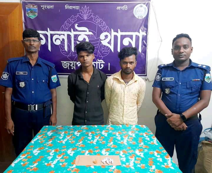 কালাই থানা পুলিশের বিশেষ অভিযানে এসআই(নিঃ)/ এসএম জুবায়ের হোসেন, সঙ্গীয় এএসআই (নিঃ) মোঃ হুমায়ন কবীর, কং/৪১৪ মোঃ জাকিরুল ইসলাম, কং/৬৯৯ মোঃ শহিদুল ইসলাম, সকলেই কালাই থানা, জেলা- জয়পুরহাট ১২/০৯/২০২২ খ্রিঃ তারিখ ১৪:৫৫ ঘটিকার সময় কালাই থানাধীন বিয়ালা উত্তরপাড়া গ্রামস্থ মোঃ আব্দুল লতিফ, পিতা- মৃতঃ মাজেম উদ্দিন এর বসত বাড়ীর পশ্চিমে পাকা রাস্তার পার্শ্বে হইতে আসামী ১। মোঃ কাওছার ইসলাম (২০), পিতা- মোঃ জহুরুল ইসলাম, সাং- পার্বতীপুর, ২। মোঃ সাদ্দাম হোসেন (২২), পিতা-নুর মোহাম্মাদ, সাং- বিয়ালা (আবসন) উভয় থানা-থানা-কালাই, জেলা- জয়পুরহাটদ্বয়’কে ৪০ (চল্লিশ) পিচ ইয়াবা ট্যাবলেট, ওজন ০৪ (চার) গ্রাম, মূল্য অনুমান- ১২,০০০/-(বার হাজার) টাকা এবং ০৭ (সাত) পুরিয়া গাঁজা, ওজন- ০৫ (পাঁচ) গ্রাম, মূল্য অনুমান- ১০০/- (একশত) টাকা সহ গ্রেফতার পূর্বক কালাই থানার মামলা নং- ১০, তারিখ- ১২/০৯/২০২২ খ্র্রিঃ, ধারা- ২০১৮ সালের মাদক দ্রব্য নিয়ন্ত্রণ আইনের ৩৬(১) সারণী ১০(ক)/৩৬(১) সারণী ১৯(ক) রুজু করা হইয়াছে।