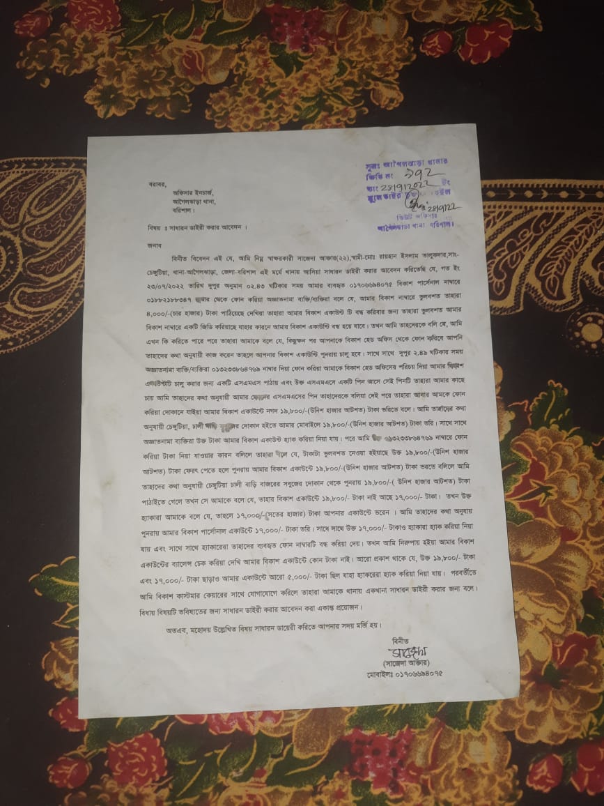 বিনীত বিবেদন এই যে, আমি নিম্ন স্বাক্ষরকারী সাজেদা আক্তার (২২), স্বামী মোঃ রায়হান ইসলাম তালুকনার, সাং চেঙ্গুটিয়া, থানা-আগৈলঝাড়া, জোলা-বরিশাল এই মর্মে থানায় আসিয়া সাধারন ডাইরী করার আবেদন করিতেছি যে, ২০/০৭/২০২২ তারিখ দুপুর অনুমান ০২:৪৩ ঘটিকার সময় আমার ব্যবহৃত ১০০ বিকাশ পার্সেনাল নাম্বারে ০১৮৮২১৮৮৩৪৭ বার থেকে ফোন করিয়া অজ্ঞাতনামা ব্যক্তি/ব্যক্তিরা বলে যে, আমার বিকাশ নাম্বারে ভুলবশত তাহারা ৪,০০০/- (চার হাজার) টাকা পাঠিয়েছে দেখিয়া তাহারা আমার বিকাশ একাউন্ট টি বন্ধ করিবার জন্য তাহারা ভুলবশত আমার বিকাশ নাম্বারে একটি জিডি করিয়াছে যাহার কারনে আমার বিকাশ একাউন্টি বন্ধ হয়ে যাবে। তখন আমি তাহদেরকে বলি যে, আমি এখন কি করিতে পারে পরে তাহারা আমাকে বলে যে, কিছুক্ষন পর আপনাকে বিকাশ হেড অফিস থেকে ফোন করিবে আপনি তাহাদের কথা অনুযায়ী কাজ করেন তাহলে আপনার বিকাশ একাউন্টি পুনরায় চালু হবে। সাথে সাথে দুপুর ২:৪৯ ঘটিকার সময় অজ্ঞাতনামা ব্যক্তি/ব্যক্তিরা 0020368966 নাম্বার দিয়া ফোন করিয়া আমাকে বিকাশ হেড অফিসের পরিচয় দিয়া আমার বিকাশ একাউন্টটি চালু করার জন্য একটি এসএমএস পাঠায়া এবং উক্ত এসএমএসে একটি পিন আসে সেই পিনটি তাহারা আমার কাছে চায় আমি তাহাদের কথা অনুযায়ী আমার ফোনের এসএমএসের পিন তাহাদেরকে বলিয়া দেই পরে তাহারা আমকে ফোন কবিয়া দোকানে যাইয়া আমার বিকাশ একাউন্টে নগদ ১৯,৮০০/- (উনিশ হাজার আটশত) টাকা ভরিতে বলে। আমি ভাষা অনুযায়ী চেঙ্গুটিয়া, ঢালী গাড়ি মুনের দোকান হইতে আমার মোবাইলে ১৯,৮০০/-(উনিশ হাজার আটশত) টাকা ভরি। সাথে সাথে। অজ্ঞাতনামা ব্যক্তিরা উষ্ণ টাকা আমার বিকাশ একাউন্ট হ্যাক করিয়া নিয়া যায়। পরে আমি ১৩২৩৩৮৬৪৭৬৯ নাম্বারে ফোন করিয়া টাকা নিয়া যাওয়ার কারন বলিলে তাহারা বলে যে, টাকাটা ভুলবশত নেওয়া হইয়াছে উরু ১৯,৮০০/-(উনিশ হাজার আটশত) টাকা ফেরৎ পেতে হলে পুনরায় আমার বিকাশ একাউন্টে ১৯,৮০০/-(উনিশ হাজার আটশত) টাকা ভরতে বলিলে আমি তাহাদের কথা অনুযায়ী চেঙ্গুটিয়া চালী বাড়ি বাজারের সবুজের দোকান থেকে পুনরায় ১৯,৮০০/- ( উনিশ হাজার আটশত) টাকা পাঠাইতে গেলে তখন সে আমাকে বলে যে, তাহার বিকাশ একাউন্টে ১৯,৮০০/- টাকা নাই আছে ১৭,০০০/- টাকা। তখন উচ্চ হ্যাকারা আমাকে বলে যে, তাহলে ১৭,০০০/- (সতের হাজার) টাকা আপনার একাউন্টে করেন । আমি তাহাদের কথা অনুযায় পুনরায় আমার বিকাশ পার্সোনাল একাউন্টে ১৭,০০০/- টাকা ভরি। সাথে সাথে উরু ১৭,০০০/- টাকাও হ্যাকারা হ্যাক করিয়া নিয়া যায় এবং সাথে সাথে হ্যাকারেরা তাহাদের ব্যবহৃত ফোন নাম্বারটি বন্ধ করিয়া দেয়। তখন আমি নিরুপায় হইয়া আমার বিকাশ একাউন্টের ব্যালেন্স চেক করিয়া দেখি আমার বিকাশ একাউন্টে কোন টাকা নাই। আরো প্রকাশ থাকে যে, উক্ত ১৯,৮০০/- টাকা এব