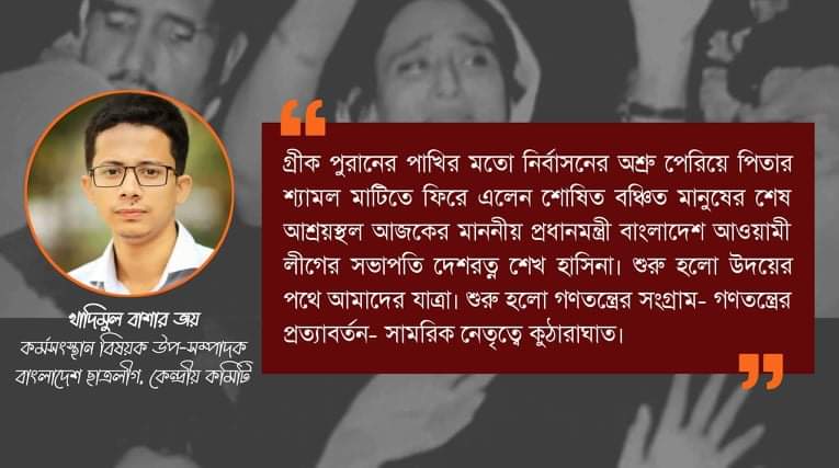 গ্রীক পুরানের পাখির মতো নির্বাসনের অশ্রু পেরিয়ে পিতার শ্যামল মাটিতে ফিরে এলেন শোষিত বঞ্চিত মানুষের শেষ আশ্রয়স্থল আজকের মাননীয় প্রধানমন্ত্রী বাংলাদেশ আওয়ামী লীগের সভাপতি দেশরত্ন শেখ হাসিনা। শুরু হলো উদয়ের পথে আমাদের যাত্রা। শুরু হলো গণতন্ত্রের সংগ্রাম- গণতন্ত্রের প্রত্যাবর্তন- সামরিক নেতৃত্বে কুঠারাঘাত।