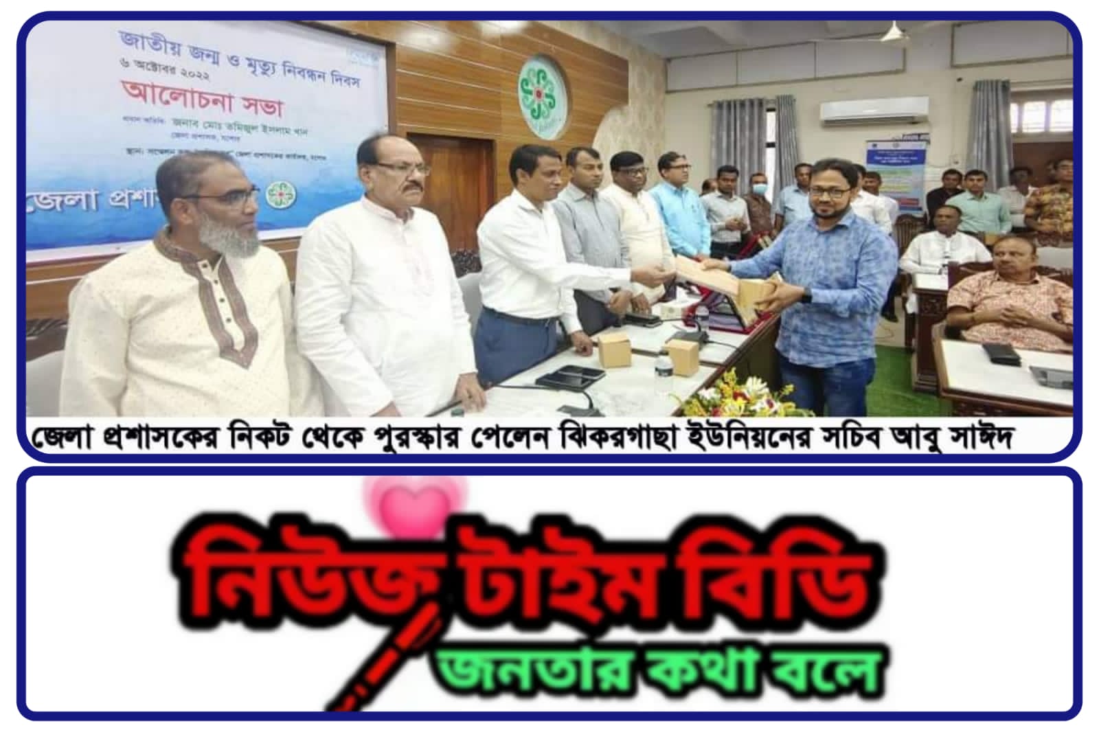 যশোরের জেলা প্রশাসকের নিকট থেকে পুরস্কার পেলেন ঝিকরগাছা উপজেলার ৬নং ঝিকরগাছা (সদর) ইউনিয়নের সচিব মোঃ আবু সাঈদ। গত ৬অক্টোবর জাতীয় জন্ম ও মৃত্যু নিবন্ধন দিবসে ৬নং ঝিকরগাছা (সদর) ইউনিয়নের জন্ম ও মৃত্যু নিবন্ধনে বিশেষ অবদান রাখায় তার কর্মপরিধি বৃদ্ধির লক্ষে এবং তাকে দেখে অপর সচিব গুলোর কার্যক্রমের গতি বৃদ্ধির জন্য যশোরের জেলা প্রশাসক মোঃ তমিজুল ইসলাম খাঁন এর নিকট হতে পুরস্কার গ্রহণ করেছেন। সচিব আবু সাঈদ ৬নং ঝিকরগাছা (সদর) ইউনিয়ন পরিষদে যোগদান করার পর উপজেলার মধ্যে শ্রেষ্ঠ ইউপি সচিব হিসেবে বিশেষ সম্মাননা পুরস্কার পান। এছাড়াও পূর্বে তিনি ঝিকরগাছা উপজেলার ৯নং হাজিরবাগ ইউনিয়নের সচিব হিসেবে তার কর্মদক্ষতার মূল্যায়ন হিসাবে জেলা প্রশাসক ও উপজেলা নির্বাহী অফিসারের কার্যালয় থেকে একাধিকবার কর্মের স্বীকৃতি পেয়েছেন। সে ঝিকরগাছা ইউনিয়ন পরিষদে যোগদান করার পূর্বে ইউনিয়ন পরিষদের কার্যক্রম নিয়ে সাধারণ মানুষের মধ্যে কিছুটা ভোগান্তি থাকলেও বর্তমানে তাকে পেয়ে ইউনিয়নের সাধারণ জনতার মাঝে স্বস্তির বাতাস বইতে শুরু করেছে।