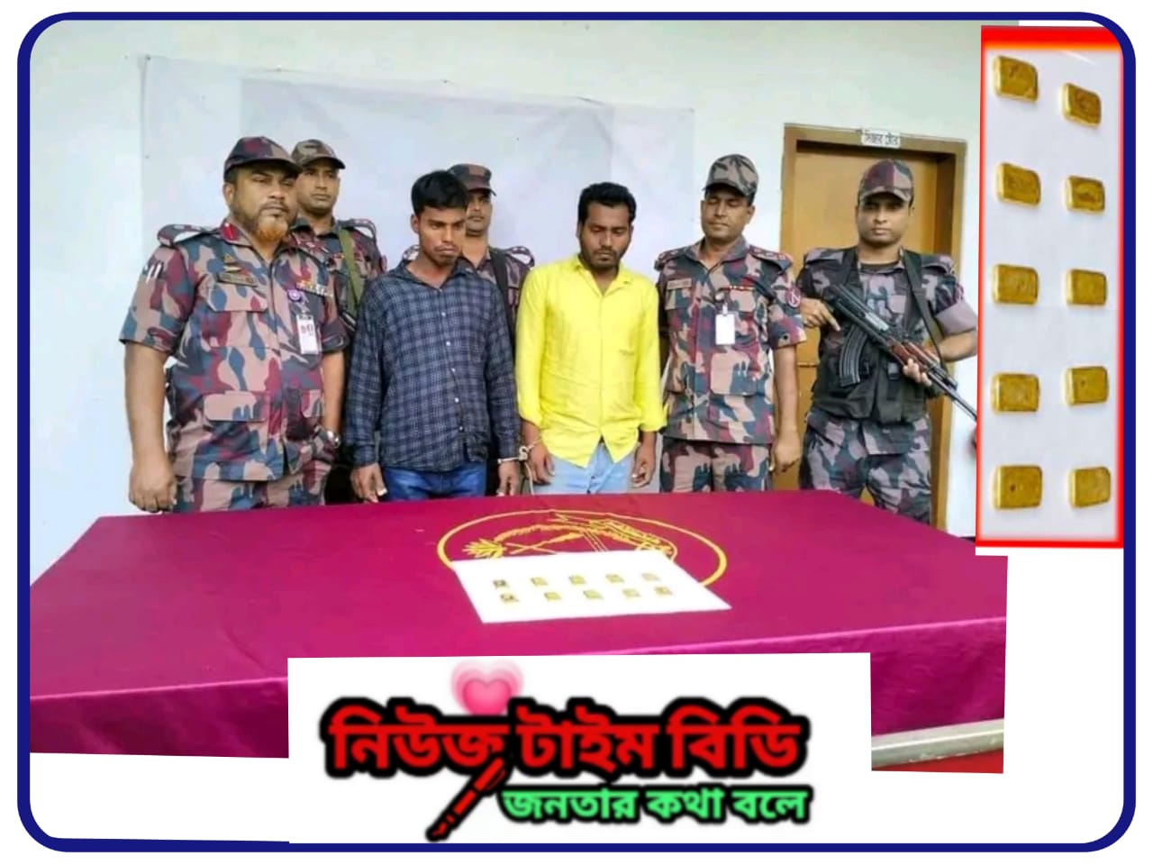 যশোর ৪৯ বিজিবি ব্যাটালিয়নের অধিনায়ক লে. কর্নেল সৈয়দ মিনহাজ সিদ্দিকী জানান.গোপন সংবাদের ভিত্তিতে গাজিপুর পাকা রাস্তার উপর অভিযান চালিয়ে ১০ পিস সোনারবার সহ দুইজনকে আটক করা হয়েছে। তাদের বিরুদ্ধে মামলা দিয়ে বেনাপোল পোর্ট থানায় সোপর্দ করা হয়েছে।