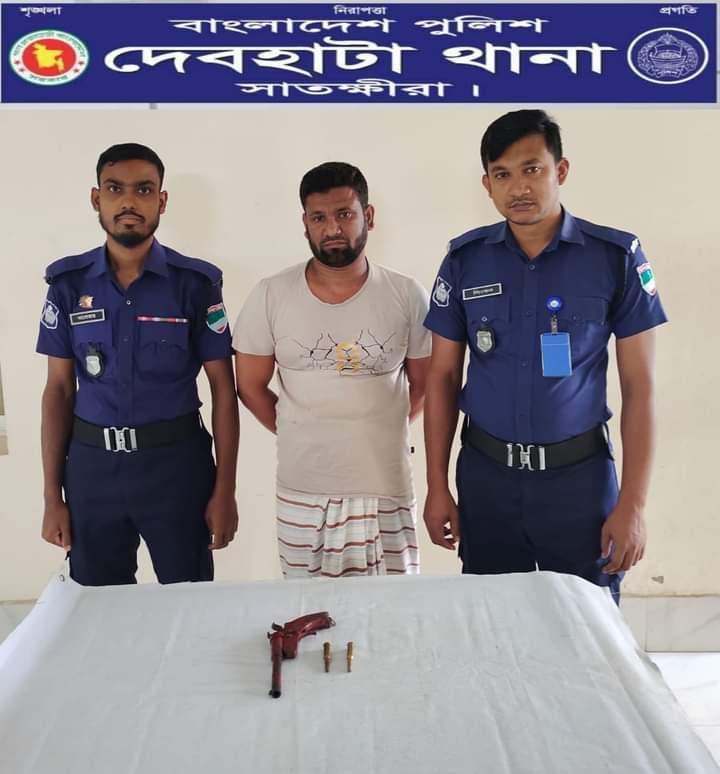 সাতক্ষীরা জেলার সুযোগ্য পুলিশ সুপার জনাব কাজী মনিরুজ্জামান মহোদয়ের দিক নির্দেশনায় অতিরিক্ত পুলিশ সুপার (প্রশাসন ও অর্থ) জনাব মোঃ সজীব খান মহোদয়, অতিরিক্ত পুলিশ সুপার (ক্রাইম এন্ড অপস্) জনাব মোঃ আতিকুল ইসলাম ও সহকারী পুলিশ সুপার (দেবহাটা সার্কেল) জনাব এসএম জামিল আহমেদ স্যারের সার্বিক তত্ত্বাবধানে এবং দেবহাটা থানার সুযোগ্য অফিসার ইনচার্জ জনাব শেখ ওবায়দুল্লাহ স্যারের নেতৃত্বে দেবহাটা থানা এলাকায় বিশেষ অভিযান পরিচালনা করাকালীন ইং-০৩/১১/২২ তারিখ, সকাল অনুমান-০৮.৫০ ঘটিকার সময় এসআই(নিঃ) শোভন দাস, এসআই (নিঃ) মোঃ শরিফুল ইসলাম, এএসআই (নিঃ) মোঃ শামীম হোসেন সংগীয় ফোর্সসহ দেবহাটা থানাধীন পারুলিয়া টু বদরতলা গাজী পাকা রাস্তার দক্ষিন পারুলিয়া (জেলে পাড়া) প্রামস্থ জনৈক ইন্জামামুল হক এর মেসার্স আয়ান ব্রিকস এর দক্ষিন পার্শ্বে ফাঁকা জায়গায়।মোঃ ইউনুছ আলী মোড়ল(৪০), পিতা-মোঃ ইয়াদ আলী মোড়ল ,স্থায়ী: গ্রাম- নোড়ারচক (পূর্ব পাড়া)) , উপজেলা/থানা- দেবহাটা, জেলা -সাতক্ষীরাকে গ্রেফতার করেন এ সংক্রান্তে দেবহাটা থানায় ০১টি অস্ত্র মামলা রুজু হয়েছে। আসামীকে ইং- ০৩/১১/২০২২ খ্রিঃ বিজ্ঞ আদালতের মাধ্যমে জেল হাজতে প্রেরণ করা হয়।
