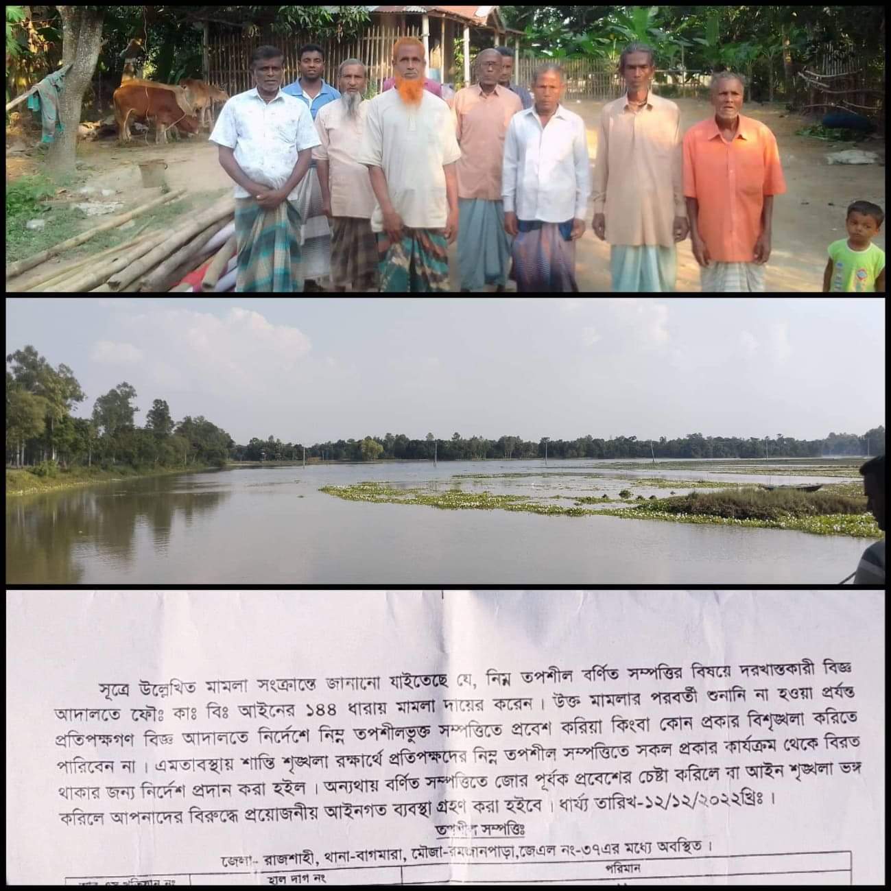 ১৪৪ ধারা মামলার বাদী মান্নান হোসেন , জিল্লুর রহমান, খলিল জাহিদ , রিয়াজ উদ্দিনসহ প্রমুখ বলেন, ১০৭ জন মিলে বিশ বছরের জন্য আমরা এই কদমতলী বিলে মাছ চাষ করি কিন্তু ১২ বছর পর এই ১০৭ জনের মধ্যে কিছু লোক তারা হলেন ইয়াসিন শাহ (৫৫) , আহম্মদ আলী (৪৫) , আল আমিন (৩৫) ,আব্দুস সাত্তার (৫৫), বাবু (২৫) প্রমুখ। তারা বাহিরে থেকে লোক নিয়ে এসে আমাদের মাছ চাষকৃত মাছের মধ্যে তারা মাছ ছাড়ে তার পর থেকে তারা আমাদের সেখানে নামতে দেই নি । মাছ মারার সময় আমরা বাঁধা দিতে গেলে বিভিন্ন ভাবে ভয়ভীতি ও হুমকি দেখায় আমরা তাদের শক্তির সাথে না পেরে আইনের আশ্রয় নিতে বাধ্য হই । আমরা এলাকাবাসী এর একটা সুষ্ঠু বিচার চাই ।